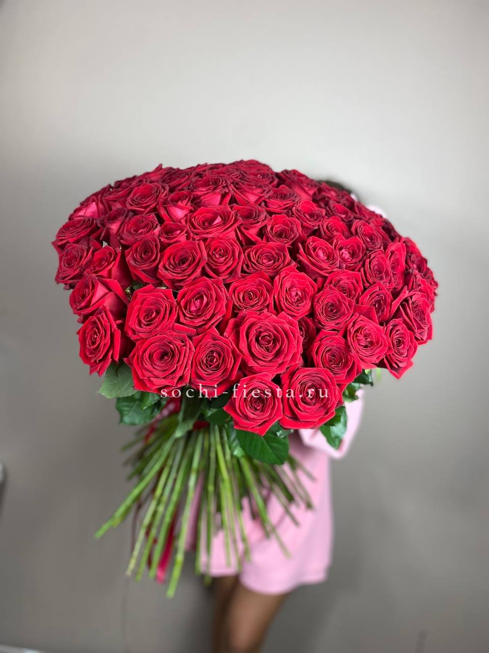 Сто одна голландская роза в букете — это история о масштабе и впечатлении. Объем композиции наполняет комнату и мгновенно притягивает внимание своим присутствием.