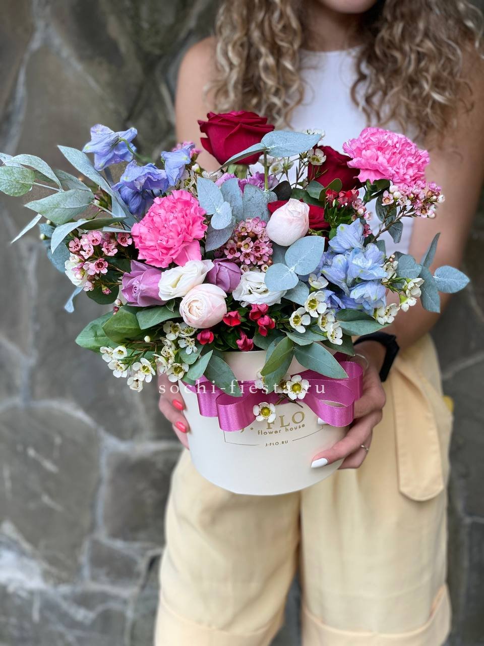 нежный бокс из французских роз сорта Венди, цилиндр D13, эвкалипт, лента, упаковка.