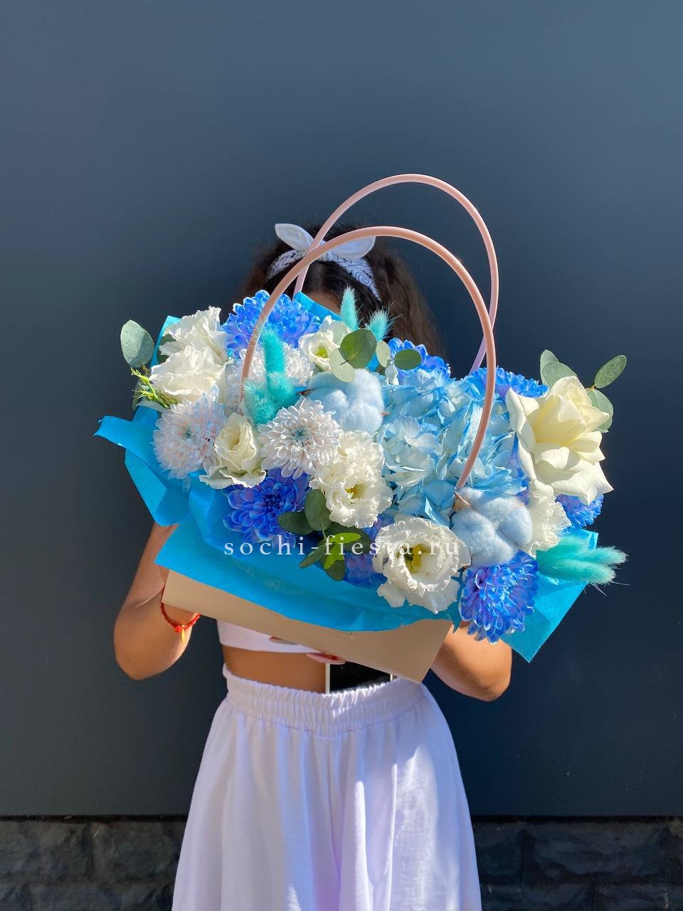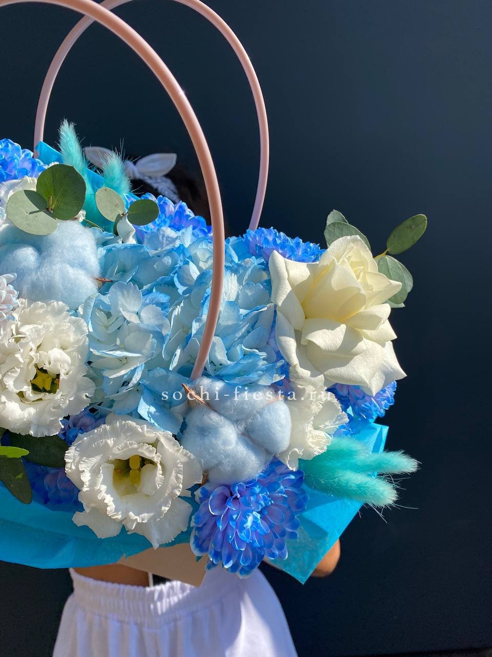 вывернутые белые розы и джумилия, цилиндр D16, эвкалипт, лента, упаковка.