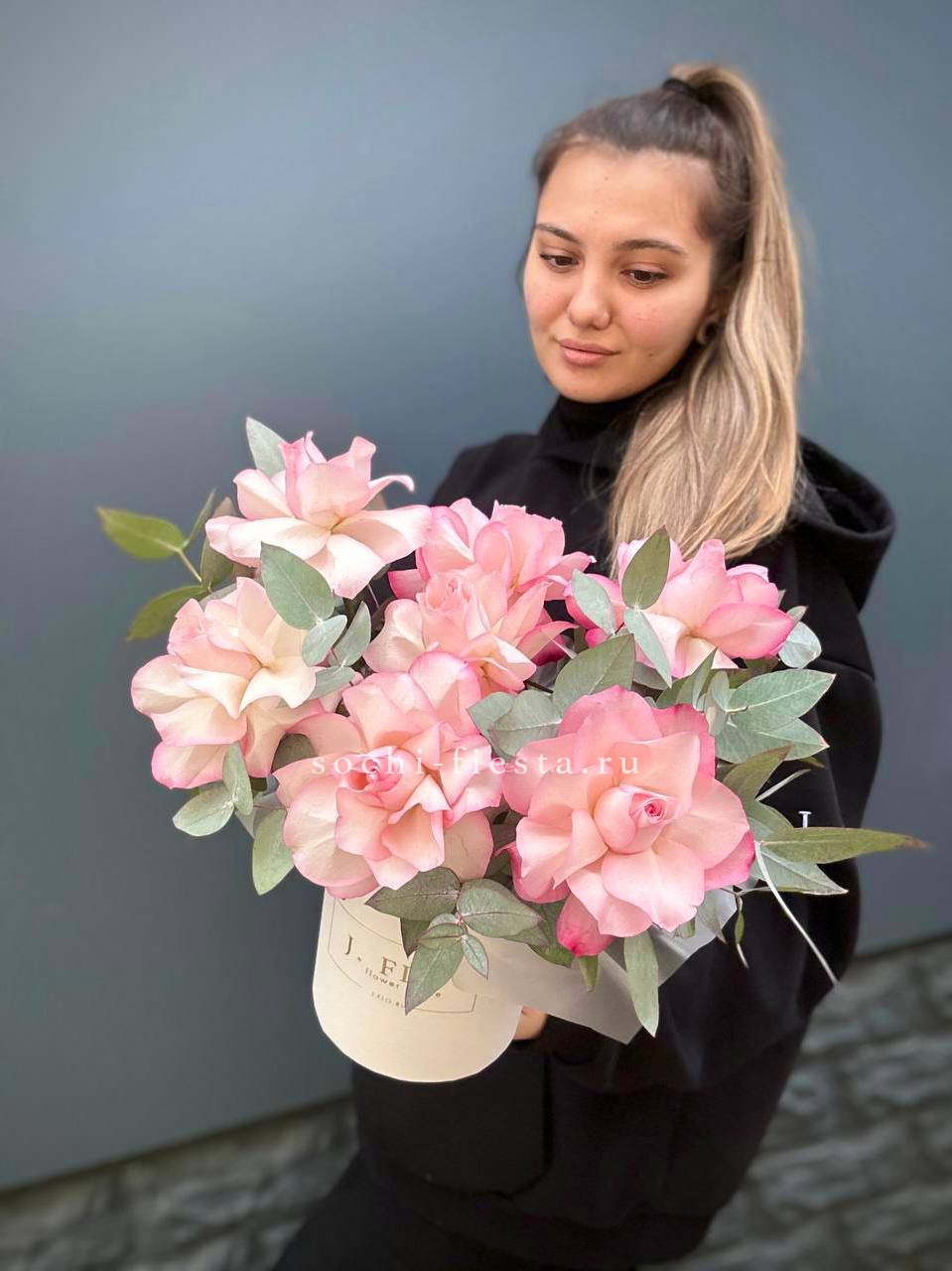 вывернутые розы, цилиндр D13, эвкалипт, лента, упаковка.