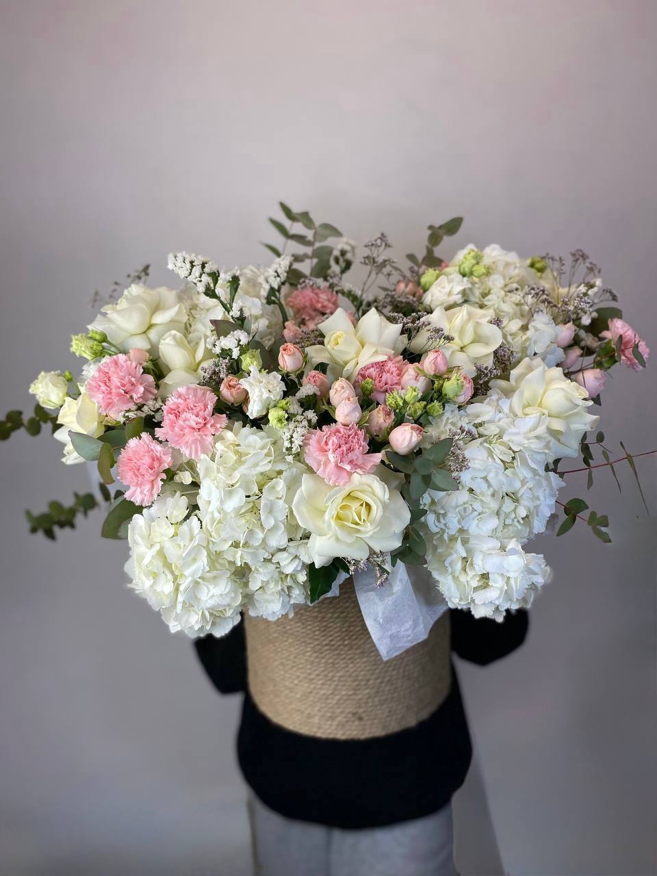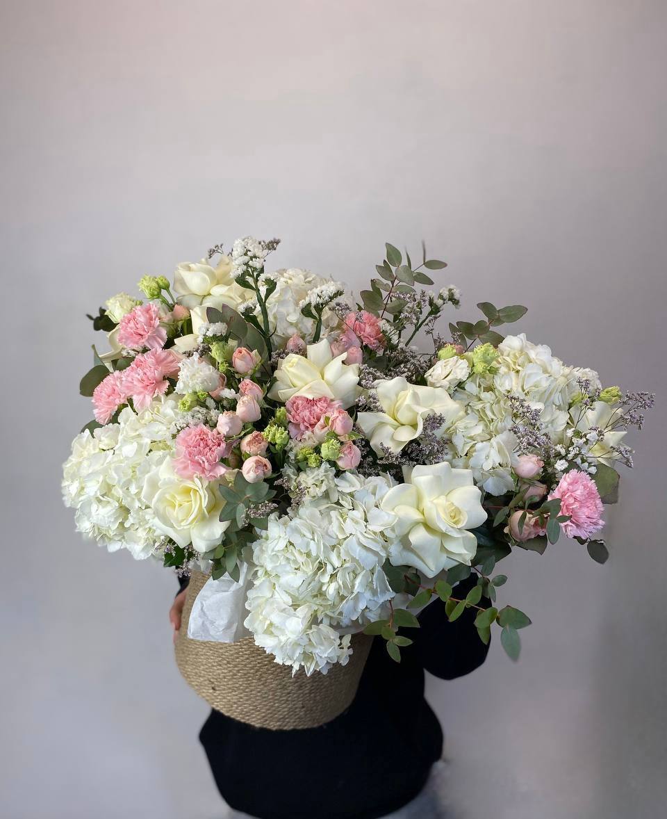 Семь пышных шапок гортензий собраны в природном джутовом кашпо. Плотные соцветия создают облачную текстуру, где каждый бутон дополняет общий объем. Композиция готова к размещению на столе или комоде без дополнительных усилий.