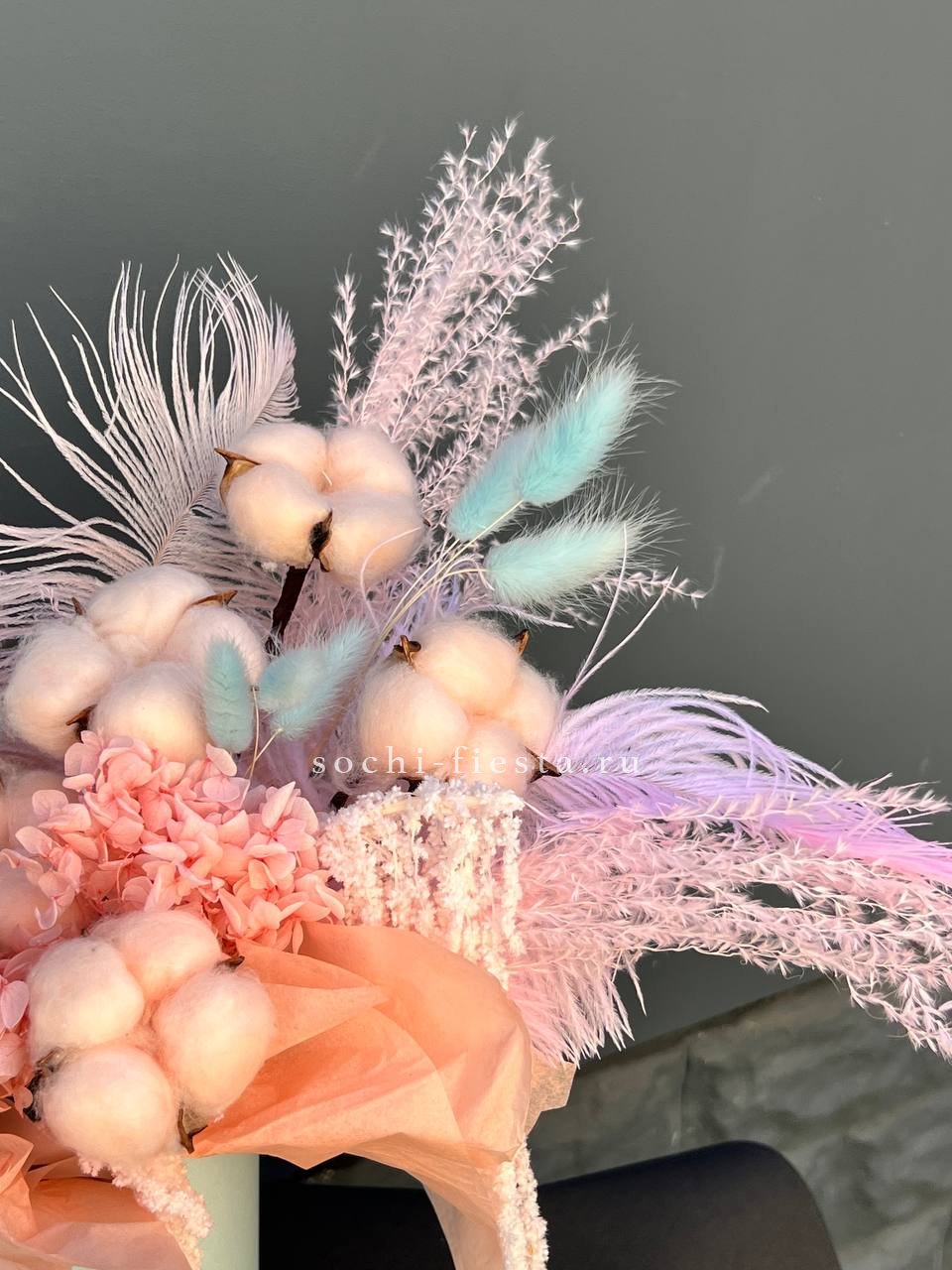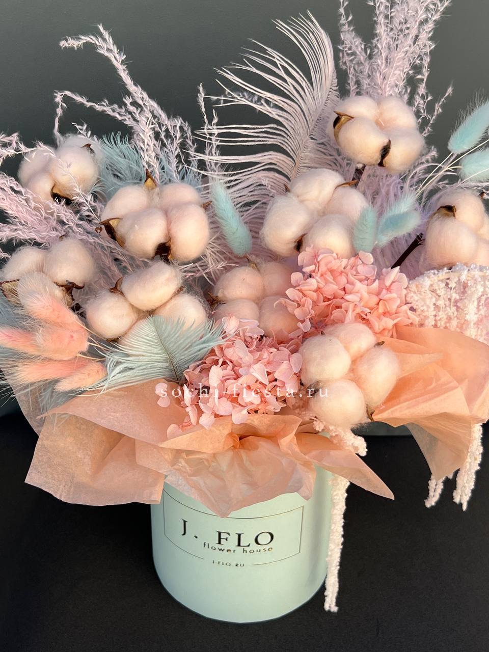 Воздушная композиция с пушистым лагурусом и хлопковыми коробочками в цилиндре. Перья добавляют легкости, амарант уравновешивает общий ритм. Сохраняет форму месяцами.
