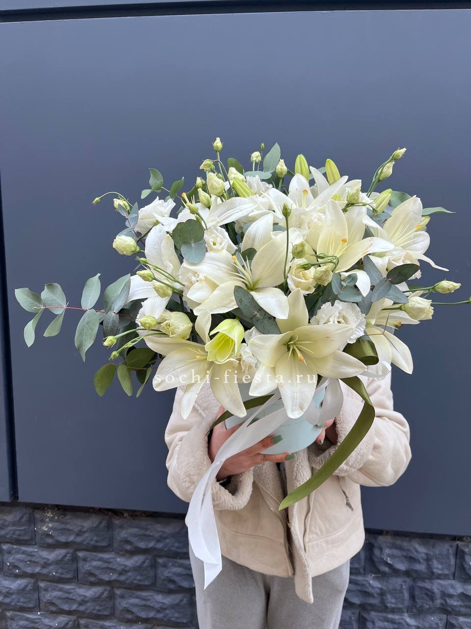 Крупные соцветия лилий соседствуют с воздушной эустомой, образуя выразительную композицию. Эвкалипт обрамляет бокс свежей зеленью, завершая гармоничную картину.