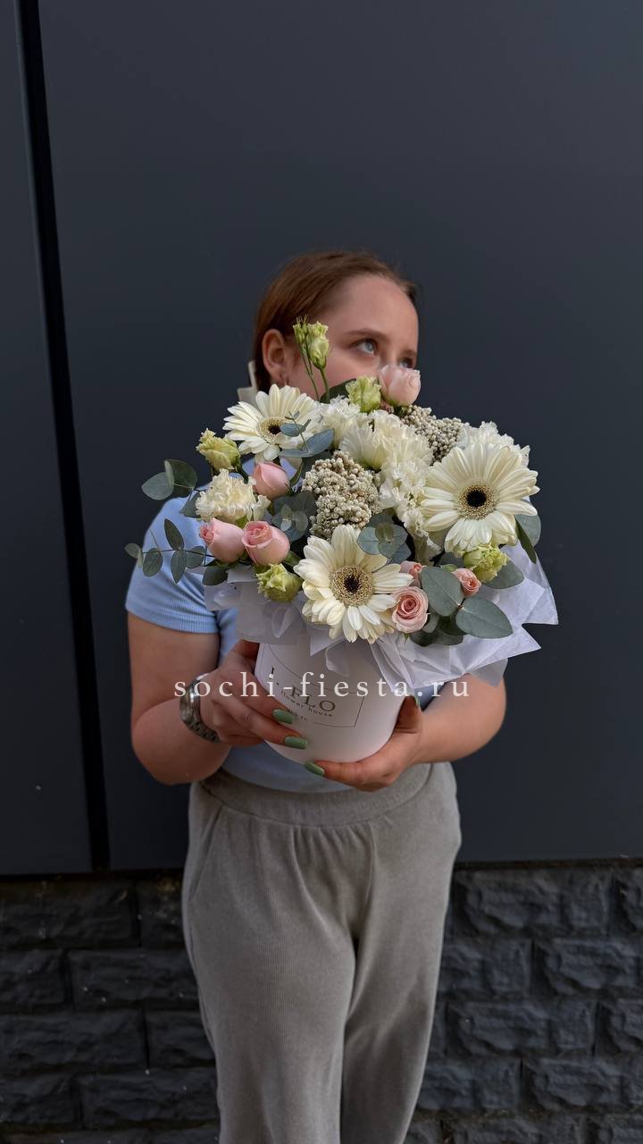 Белые розы встречаются с лиловым диантусом и кремовой эустомой в круглом боксе. Озотамнус и эвкалипт создают фактурный фон для цветочной композиции.