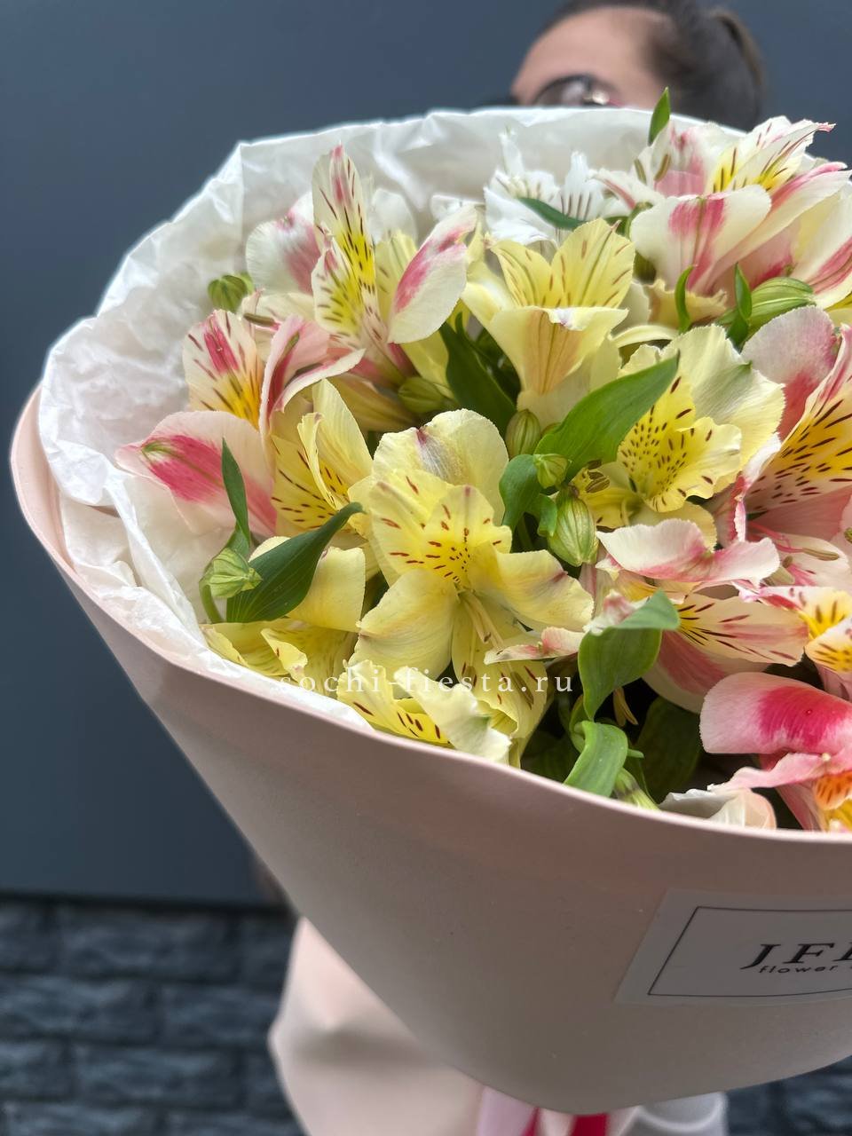 Девять альстромерий в воздушной упаковке пастельных оттенков выглядят мягко и свежо. Бутоны разной степени раскрытия добавляют букету глубины и лёгкой игривости.