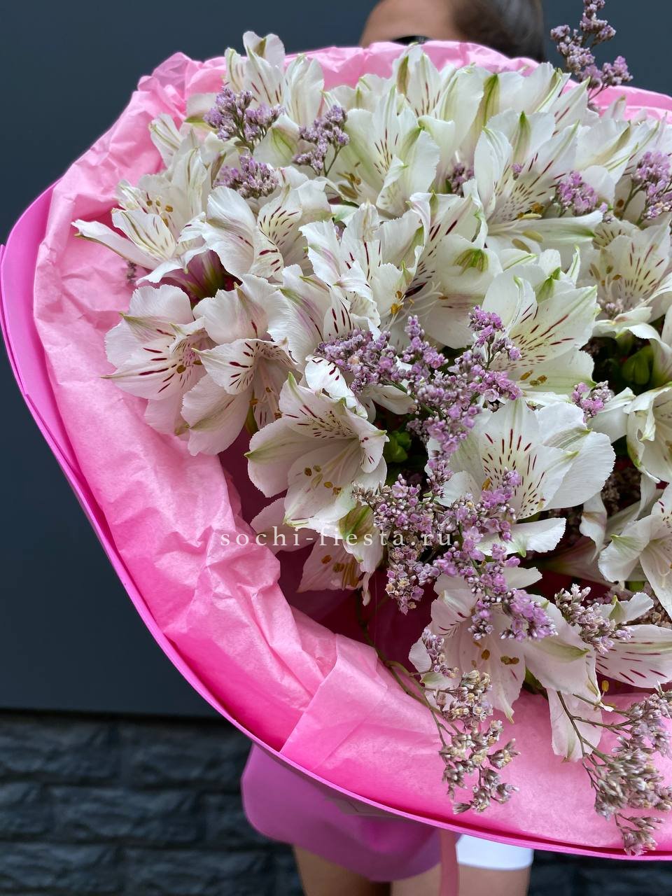 Одиннадцать белых альстромерий собраны в плотный букет с воздушным лимониумом. Светлая гамма и простая форма легко вписываются в любой интерьер. Универсальное решение для дома или в подарок близким.