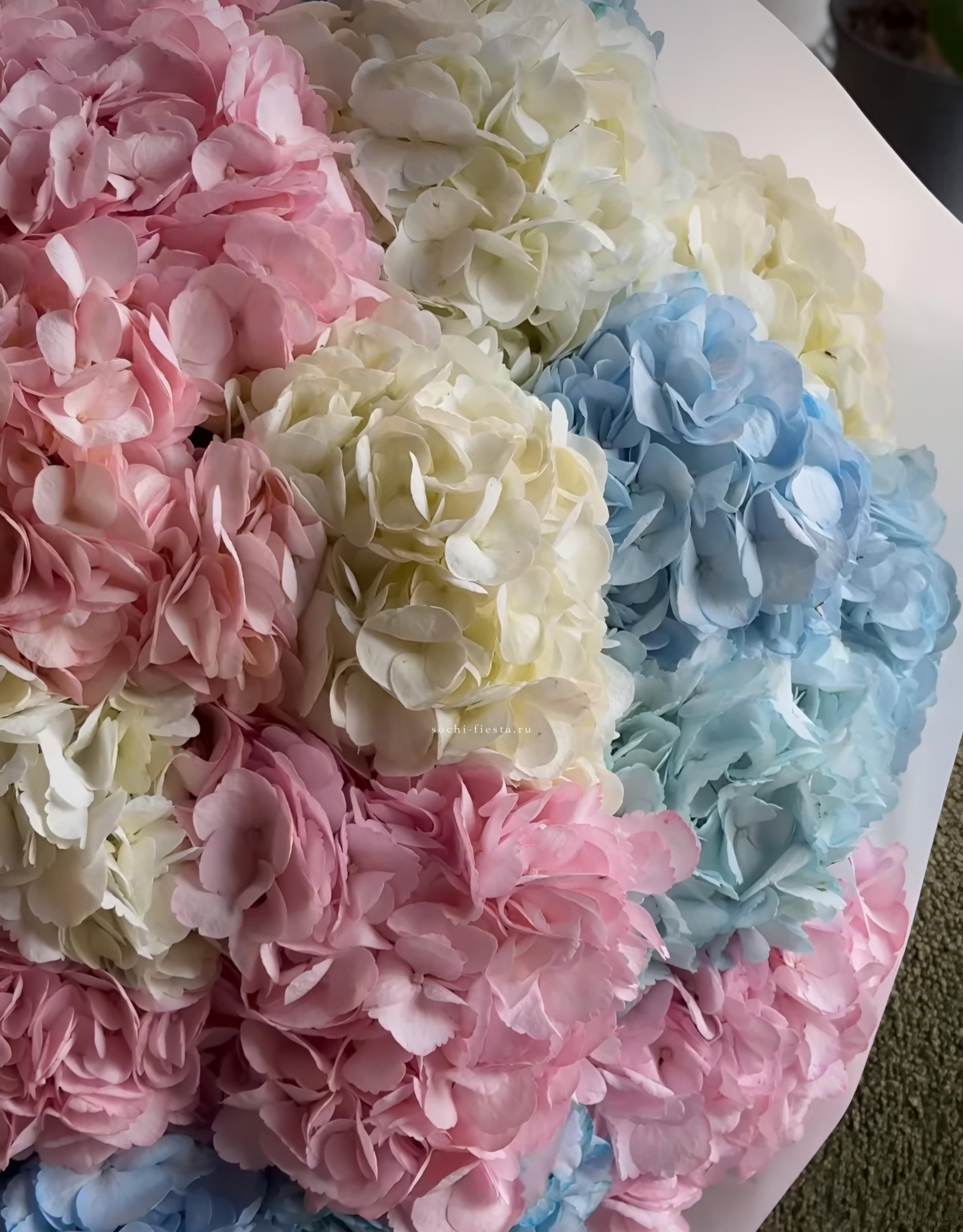 Пятнадцать соцветий гортензии образуют густую сферу с насыщенной глубиной цвета. Объёмная композиция заполняет пространство и притягивает внимание своей плотностью.