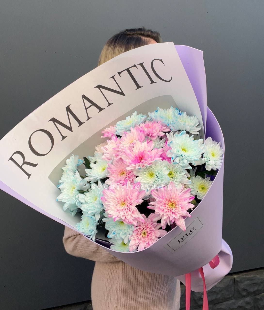 Девять веток кустовых хризантем раскрываются пышной шапкой мелких соцветий. Авторская упаковка добавляет графичности без лишних деталей. Букет держит форму и радует долгим цветением.