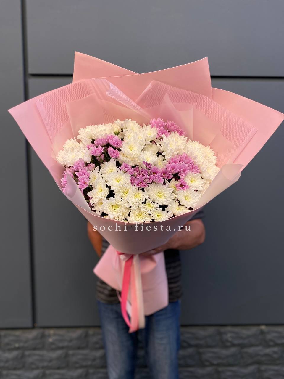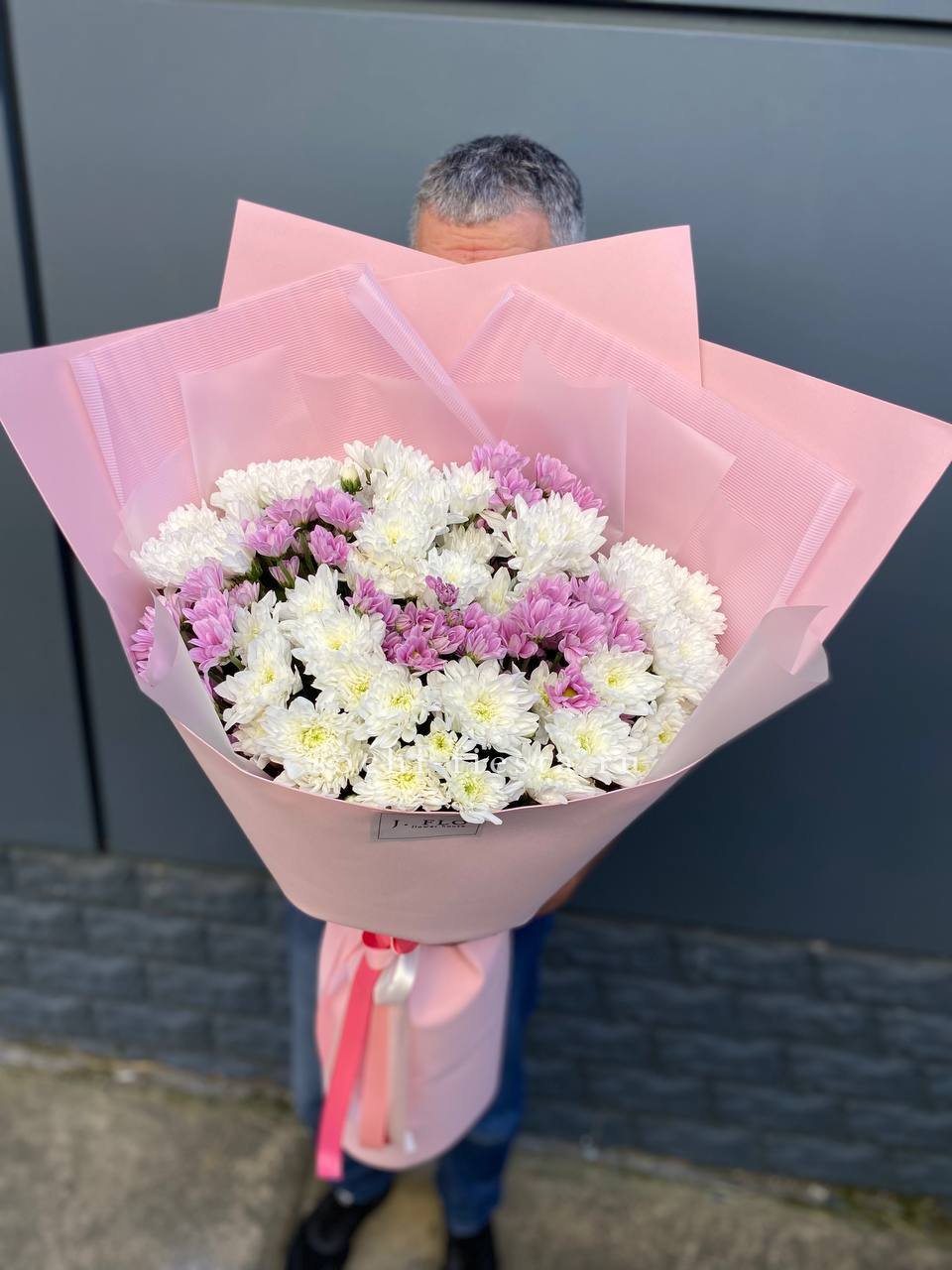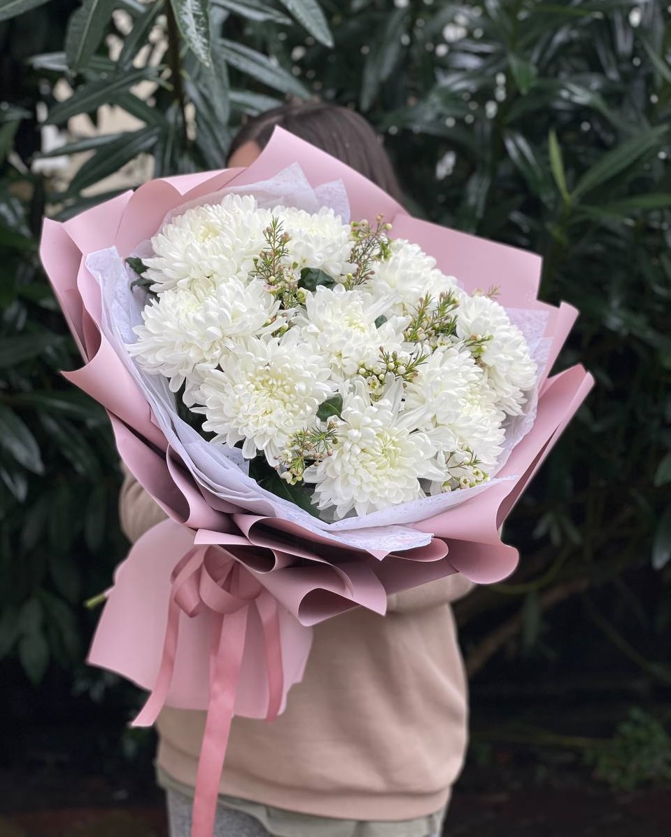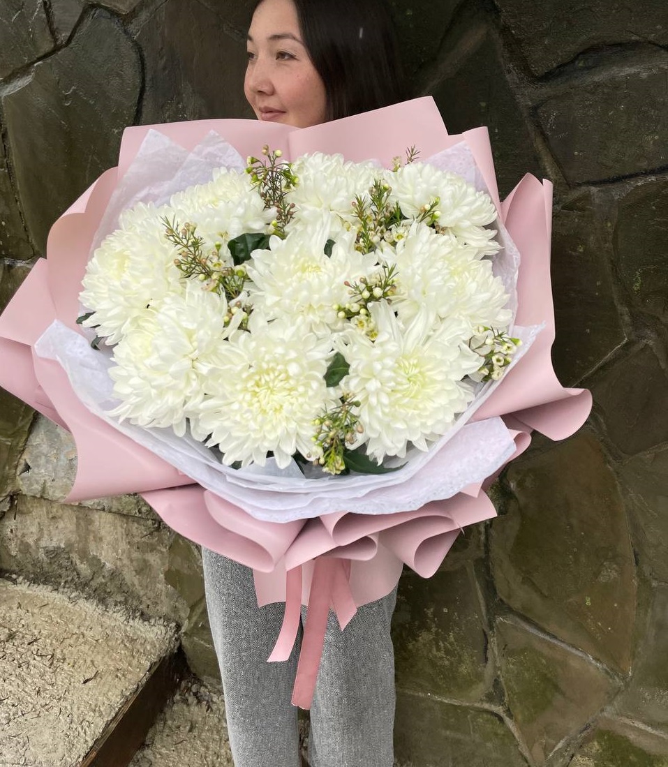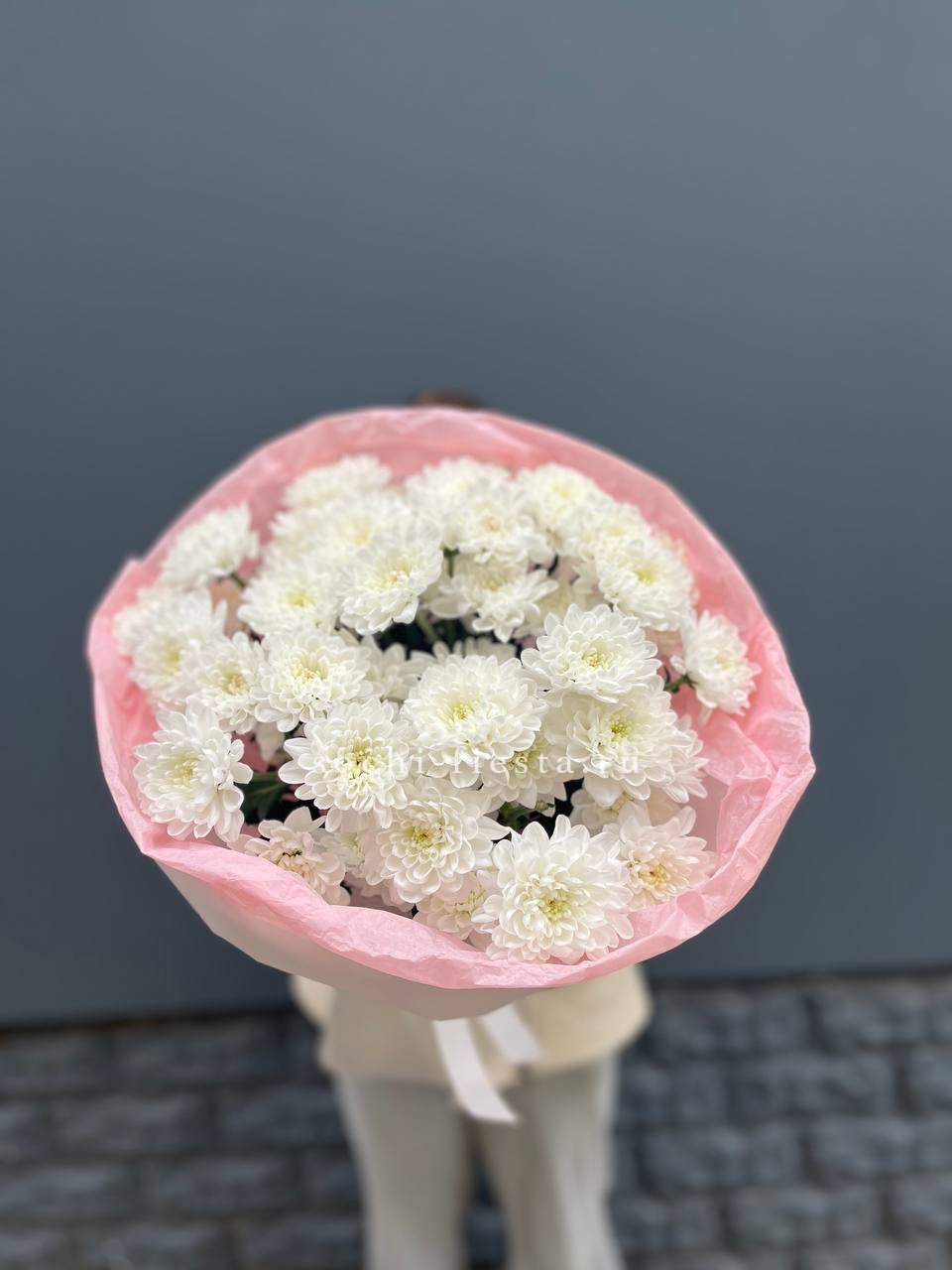 Пятнадцать веток кустовых хризантем с множеством бутонов создают пышную композицию с воздушной фактурой. Оформление из фоамирана добавляет букету завершенность и мягкий силуэт.