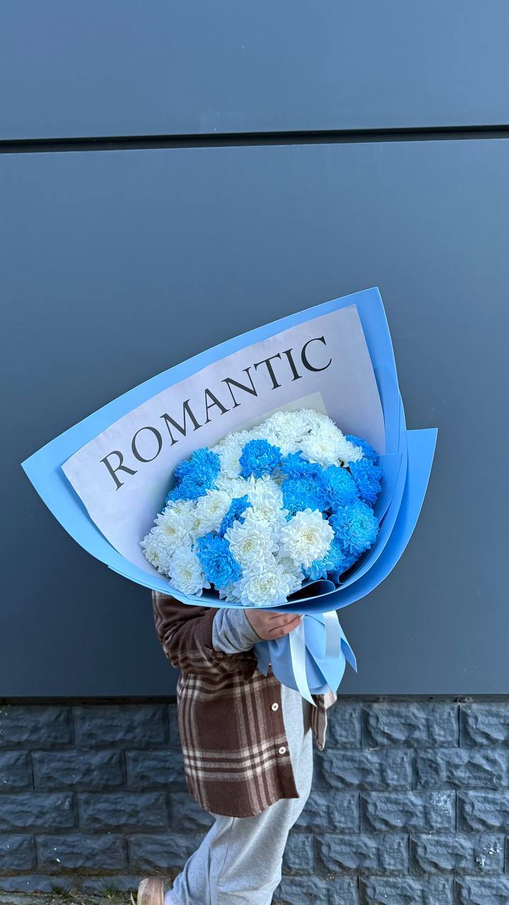 Контрастный микс из белоснежных и лазурных хризантем — идеальный способ сказать о самом важном. Лаконичный дизайн упаковки подчеркивает яркость цветов, а надпись Romantic говорит сама за себя. Подарите незабываемые эмоции и частичку нежности тому, кто вам дорог!