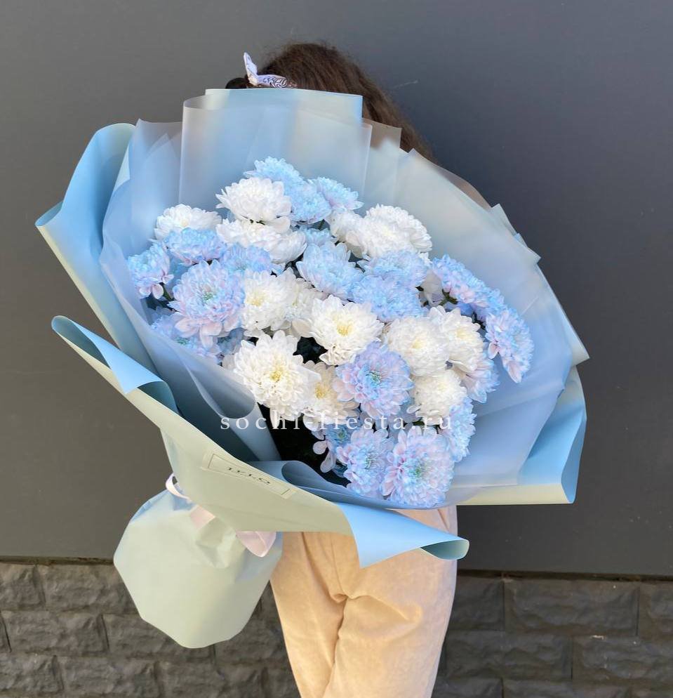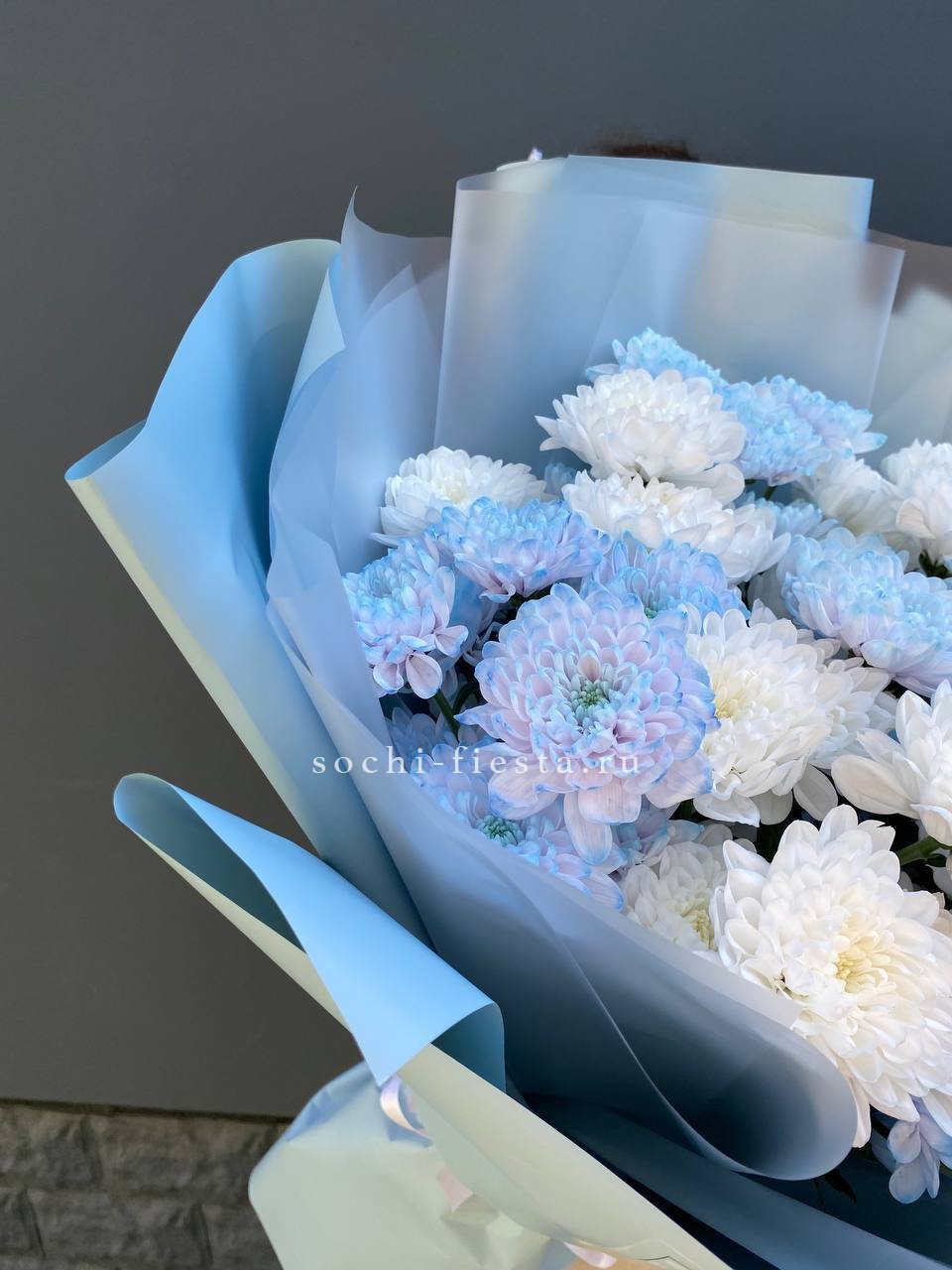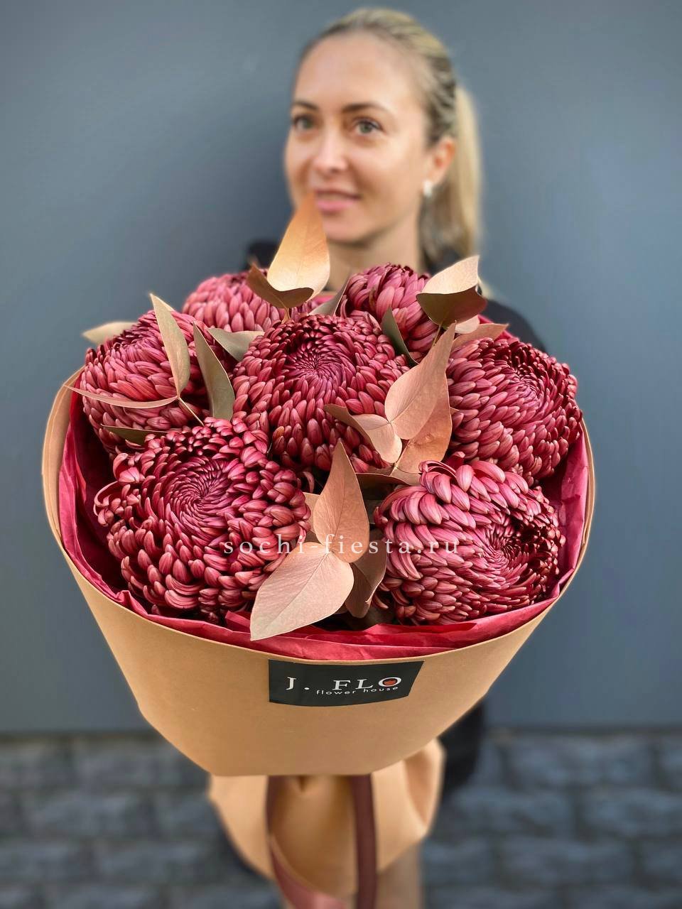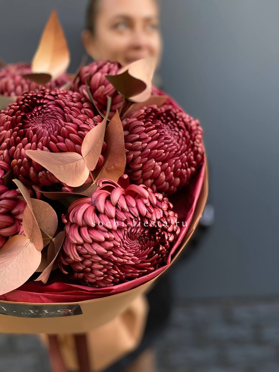 хризантемы - 7 шт, эвкалипт,  лента, дизайнерская упаковка.