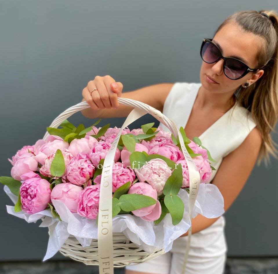 29 пионов, эвкалипт, корзина, лента.