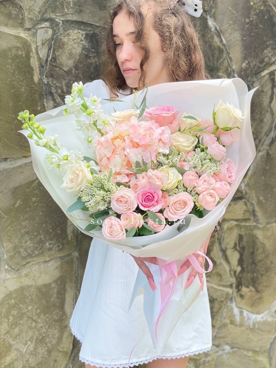 Пышная гортензия задает объем, а розы и матtiола выстраивают живописную глубину композиции. Вероника добавляет вертикальные линии, эвкалипт смягчает переходы между соцветиями. Букет с продуманной архитектурой и авторским почерком.