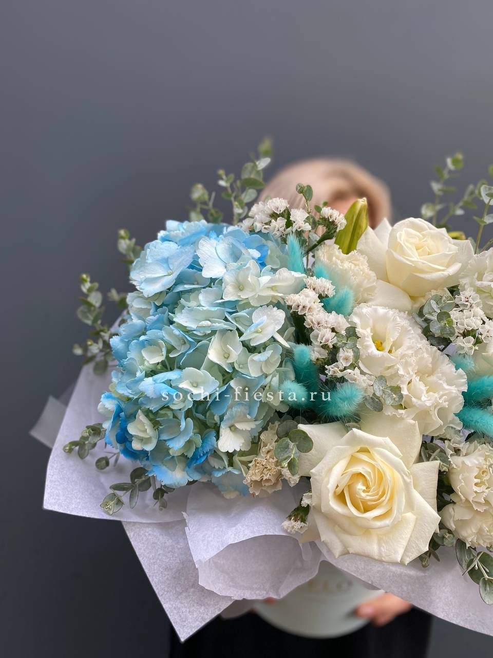 Гортензия и кустовые розы соединяются с веточками эвкалипта и ваксфлауэра в свободной композиции. Разная плотность соцветий создаёт живой ритм и природную лёгкость.