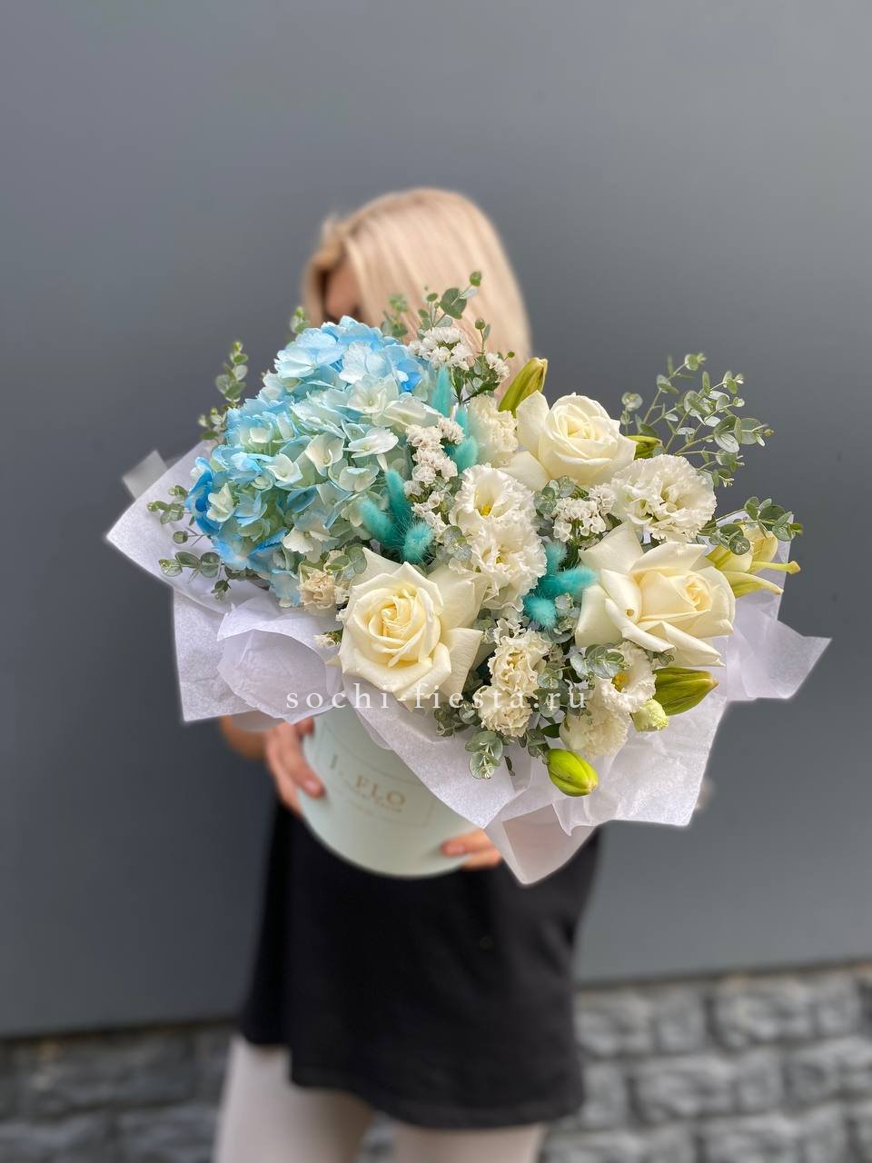 гортензия, кустовые розы, эвкалипт, ваксфлауэр (или аналог), лента, цилиндр D20.