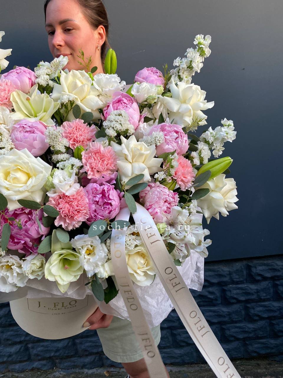 пионы, лилии, белые розы, эустомы, диантусы, маттиолы, статица, альстромерия, эвкалипт, цилиндр - D25, лента, упаковка. Состав может меняться в зависимости от сезона.