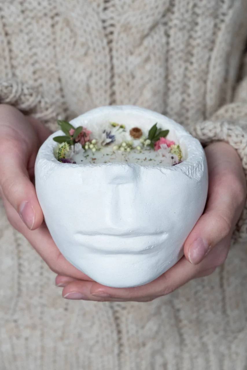 Гипсовая свеча с натуральным кокосовым воском горит до 30 часов и сохраняет аромат целый год. Сухоцветы в основании создают объёмную композицию, которая работает как декор даже без огня.