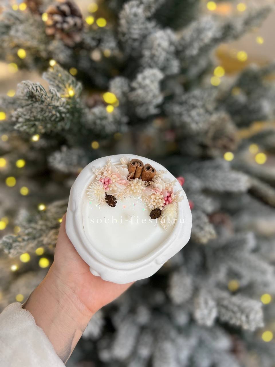 Скульптурная форма из гипса с кокосовым воском и ароматом бузины. Руки бережно держат свечу, создавая камерное пространство для вечернего света и тишины.