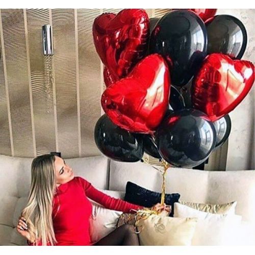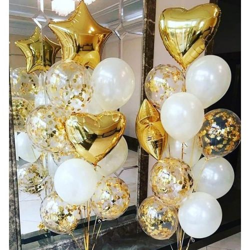 9 шт. фольгированных кругов цвета розовое золото, 13 шт. латексных шаров серого (или белого) цвета, грузик. Все шары мы предварительно обрабатываем специальным составом Highfloat, обеспечивая им длительный срок полета.