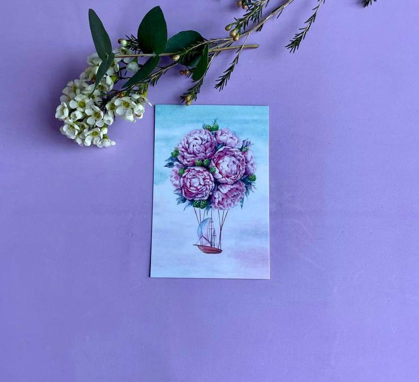 Открытка с романтичной иллюстрацией воздушного шара из пионов. Внутри достаточно места для искренних строк, которые усилят впечатление от момента вручения.