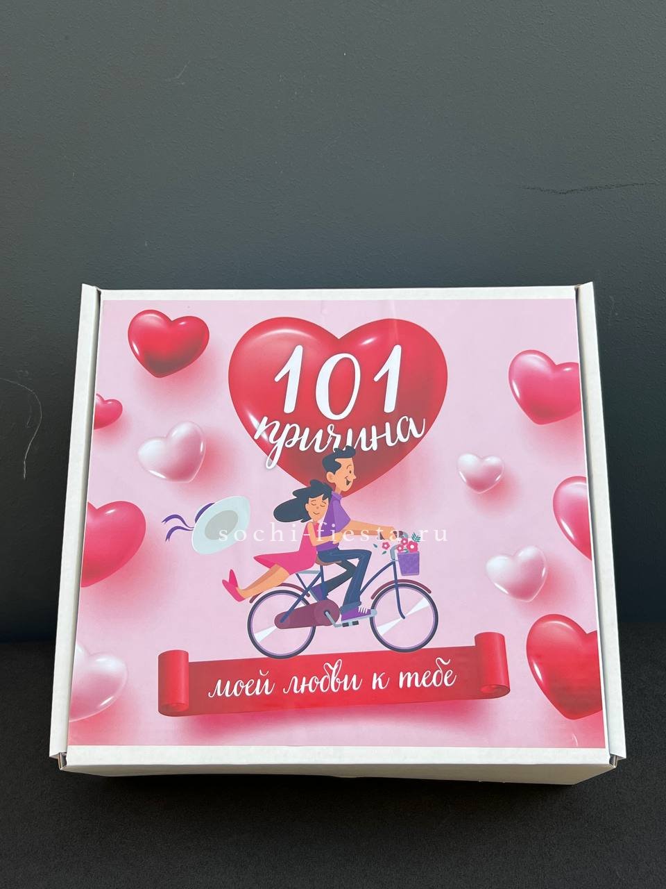 Сто одна плитка шоколада и чай в одном наборе превращают простую идею в визуальное высказывание. Повод написан цифрой, а эмоция считывается с первого взгляда.