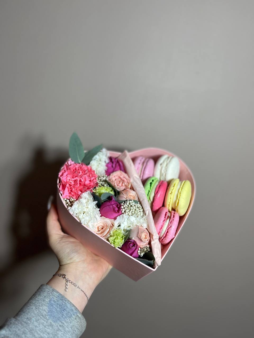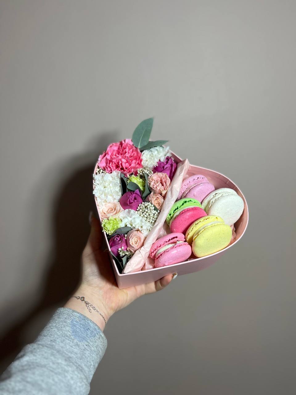 мисти баблс, бомбастик, эустома, эвкалипт, озатамус, макаронс, сердце коробочка.