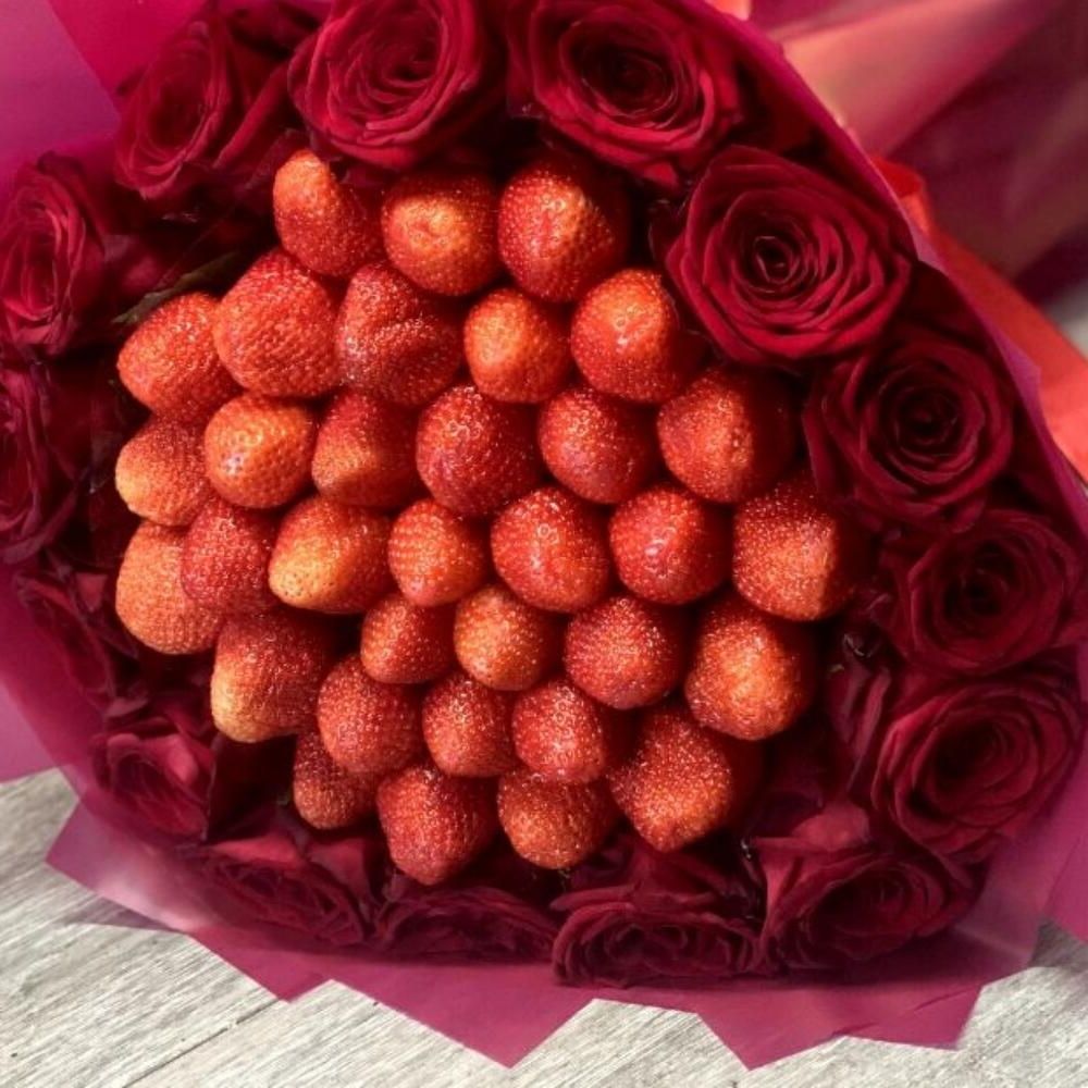 Пятнадцать роз обрамляют спелую клубнику в композицию с явным характером. Сочная ягода и бархатные бутоны создают яркий дуэт для тех, кто любит удивлять.