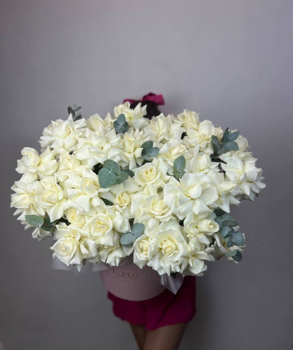 Эустомы и пионовидные розы соседствуют с французскими макарон в коробке в форме сердца. Диантусы и эвкалипт создают объём, а сладкий акцент делает композицию завершённой.