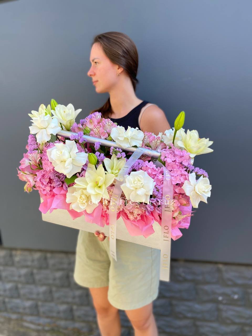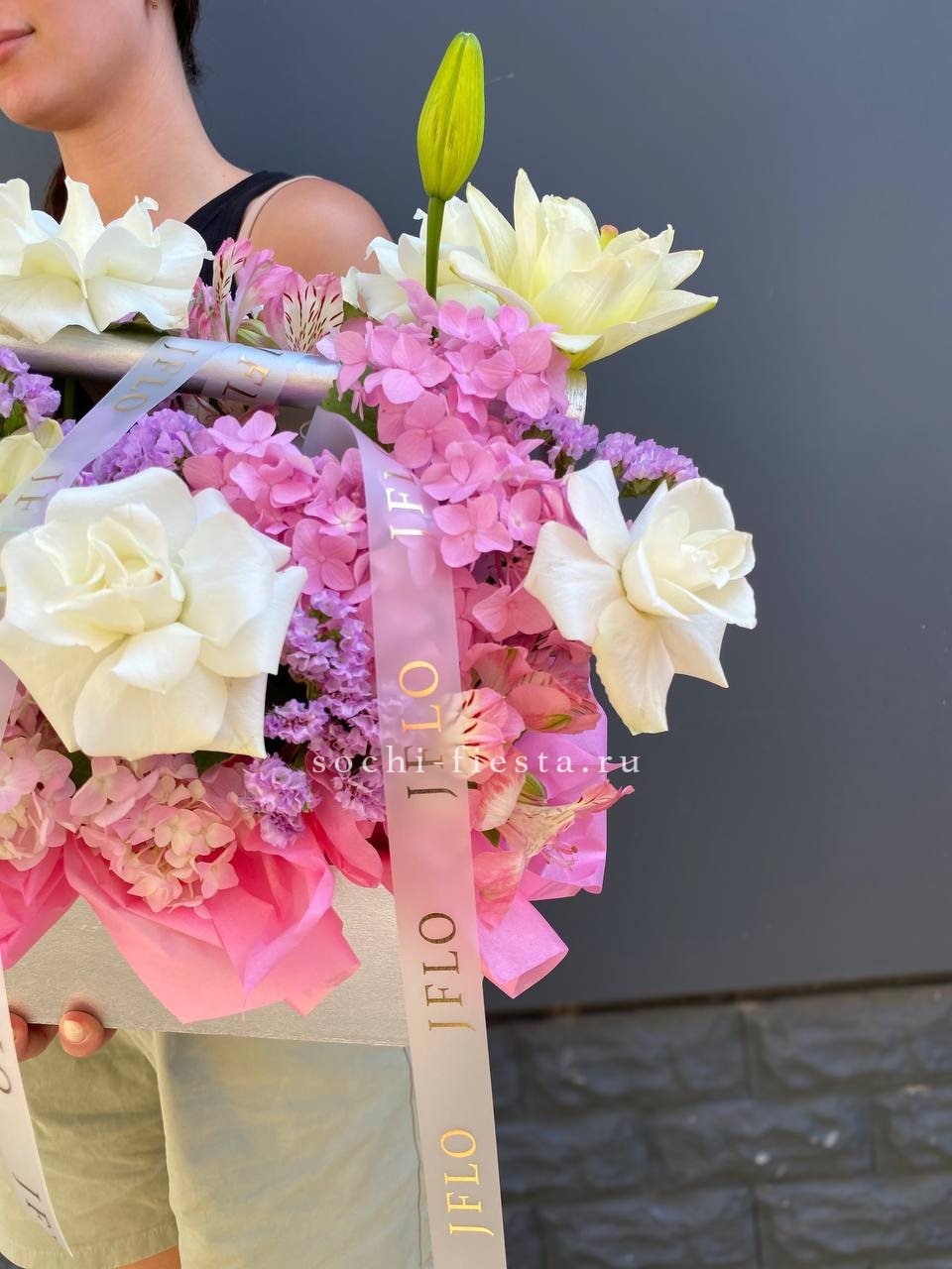 Лилии задают вертикальный ритм композиции, а французские розы и гортензия заполняют объем мягкими переходами формы. Альстромерия и статица добавляют графичности общему силуэту.
