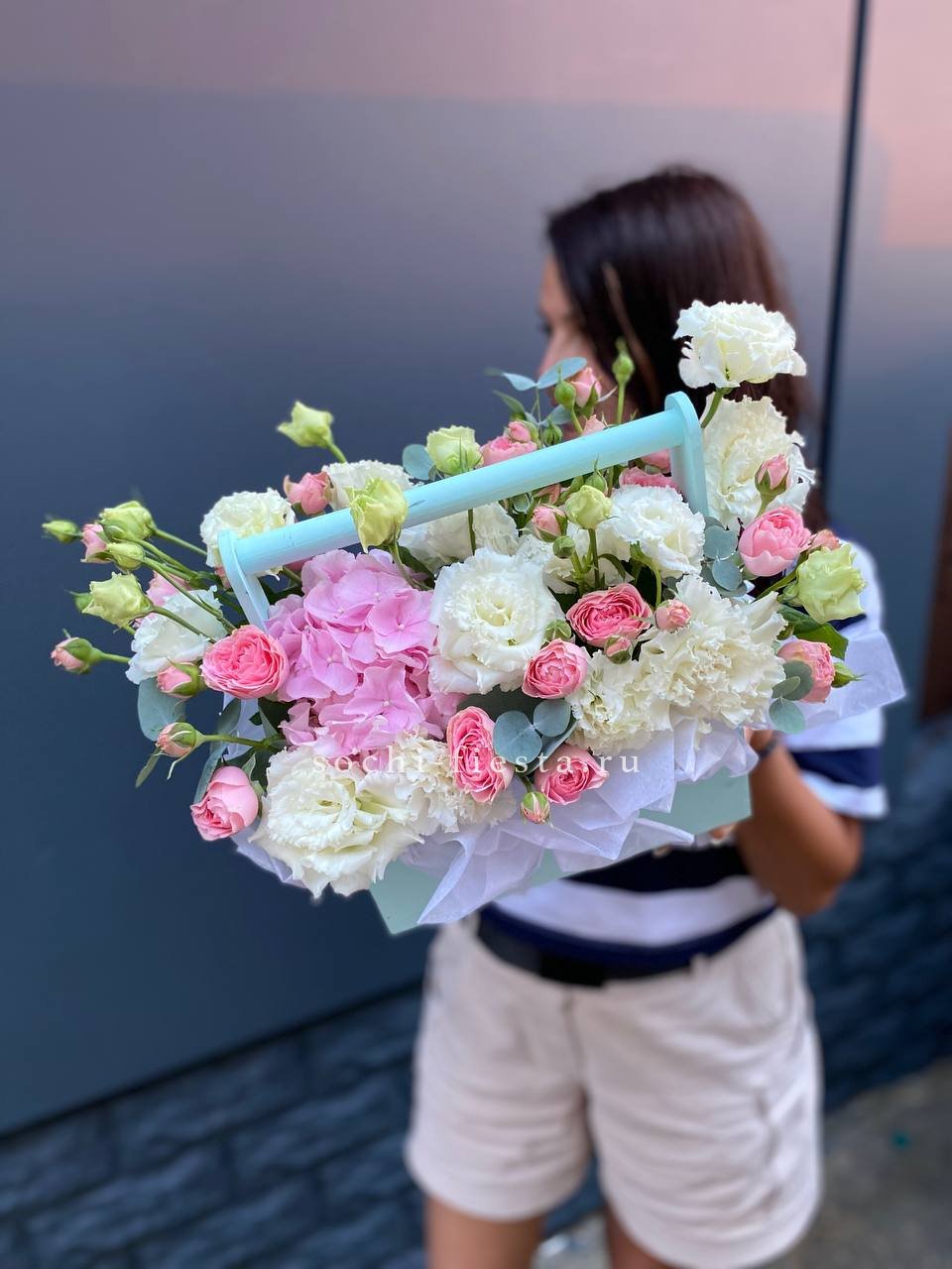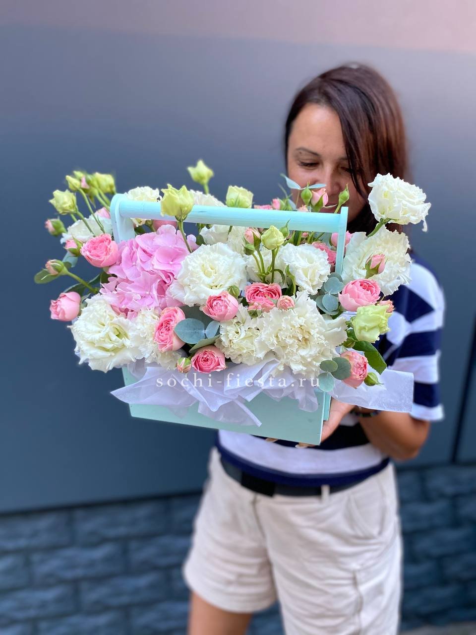 гортензия, пионы Сара Бернар, роза белая, гипсофила (замена вне сезона), дельфиниум (замена вне сезона), эвкалипт, деревянный ящик, лента.