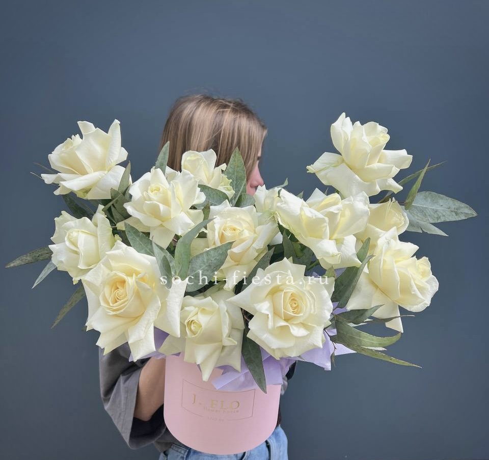Пионовидные розы раскрываются пышными шапками среди воздушной гортензии и эустомы. Композиция собрана в круглом боксе и держит форму без дополнительной упаковки.