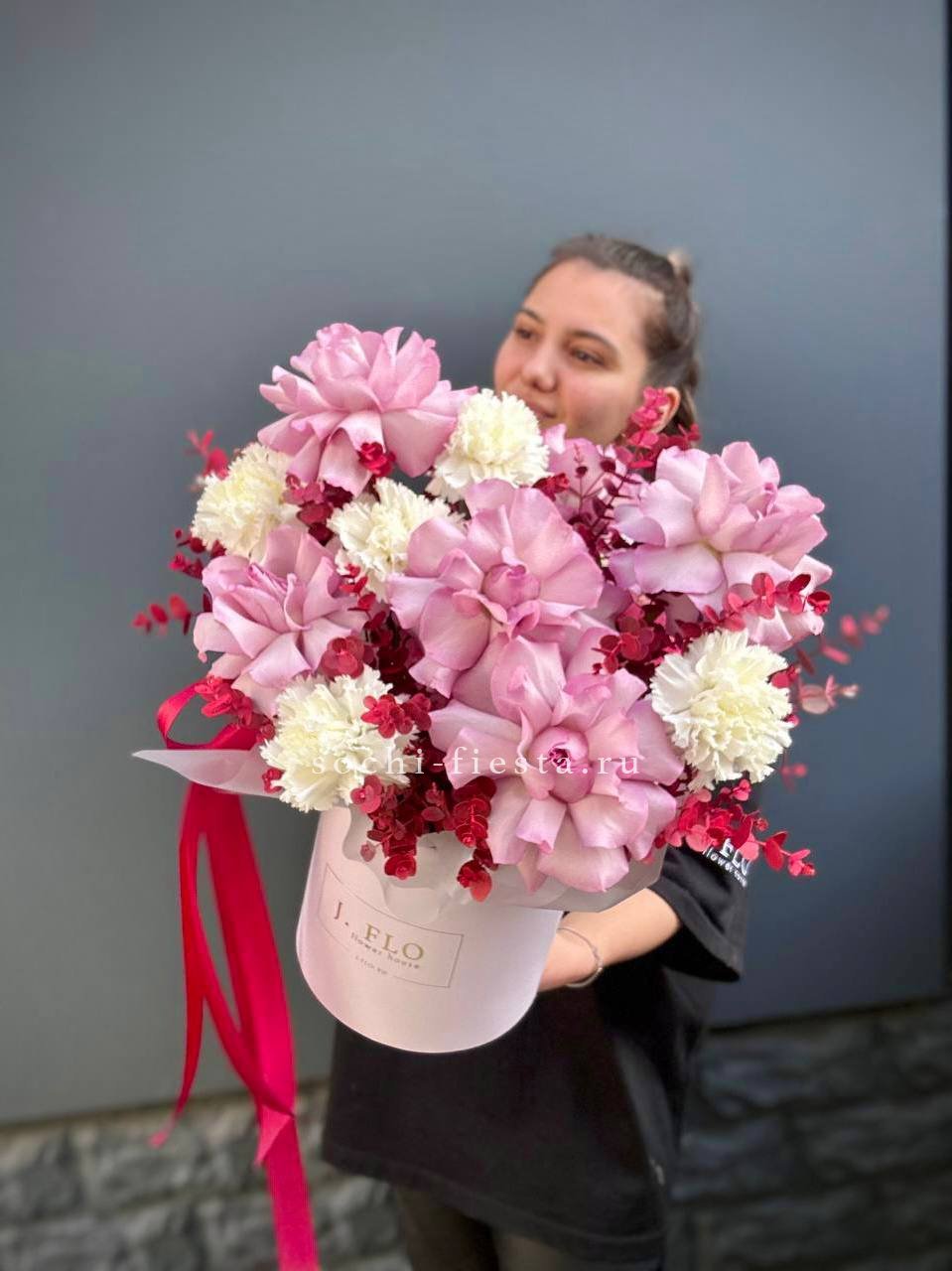 Французские розы цвета утренней зари дополнены воздушными соцветиями диантуса. Эвкалипт добавляет серебристые ноты и завершает округлую форму бокса.
