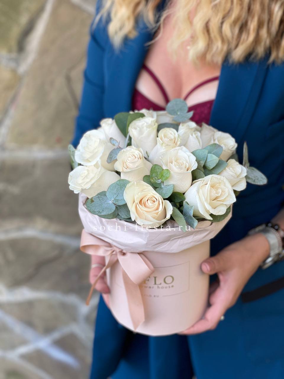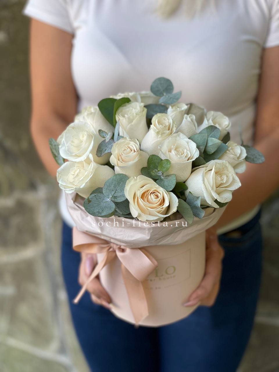 Двадцать пять белых роз выстроены ровными рядами, образуя безупречный круг. Минималистичная подача в цилиндре подчёркивает графичность и строгость линий.