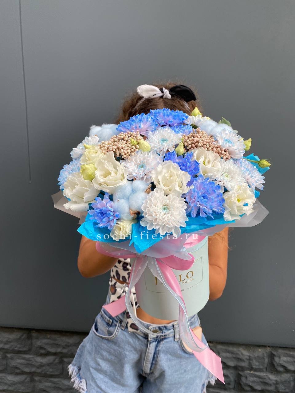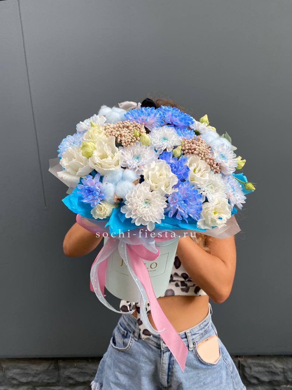 гортензия, французские розы, диантусы, эустома, цилиндр D16, бумага тишью.