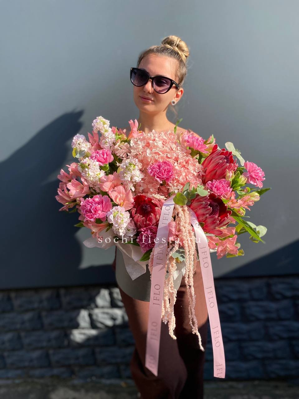 Протеи привносят графичность и экзотичный силуэт. Матиолла и альстромерии смягчают линии, а диантусы расставляют акценты по всей композиции.