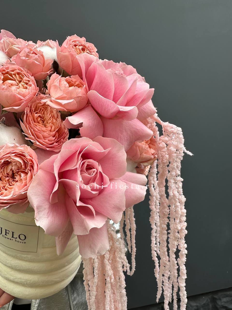 Розовая палитра переходит от французских роз к кустовым Джульетта с добавлением хлопка. Композиция в цилиндре сочетает воздушность и плотность фактур.