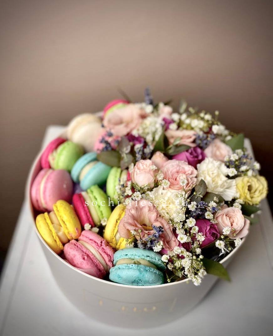 пионовидные розы Мисти Баблс, эустома круглая коробка D20, 6 макаронс.