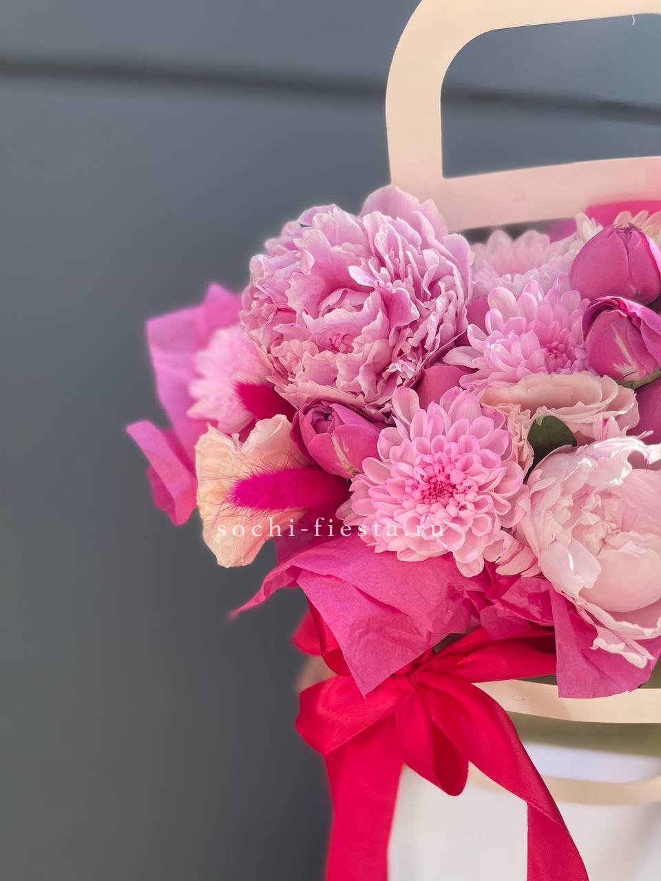Пионы раскрываются среди кустовых роз и хризантем, а лагурус добавляет мягкие текстурные акценты. Сумка-кашпо с лентой удерживает форму и позволяет композиции сохранять объем. Сезонное сочетание с природной гармонией.