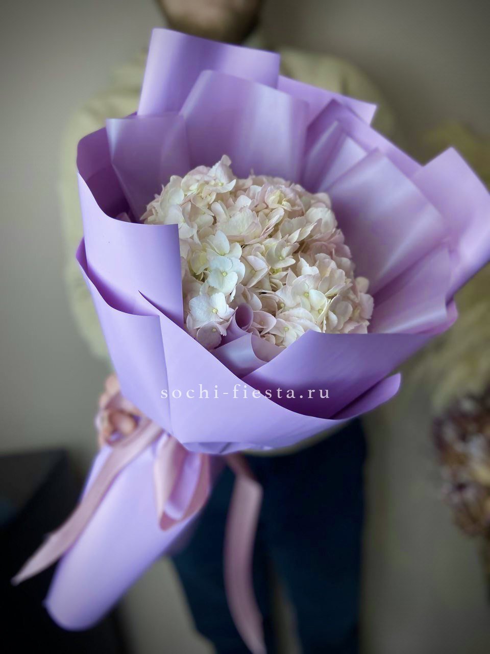 гортензия розовая, лента, дизайнерская упаковка. Цвет гортензий может незначительно отличаться. Данная цена доступна при единовременном заказе от 10 шт.