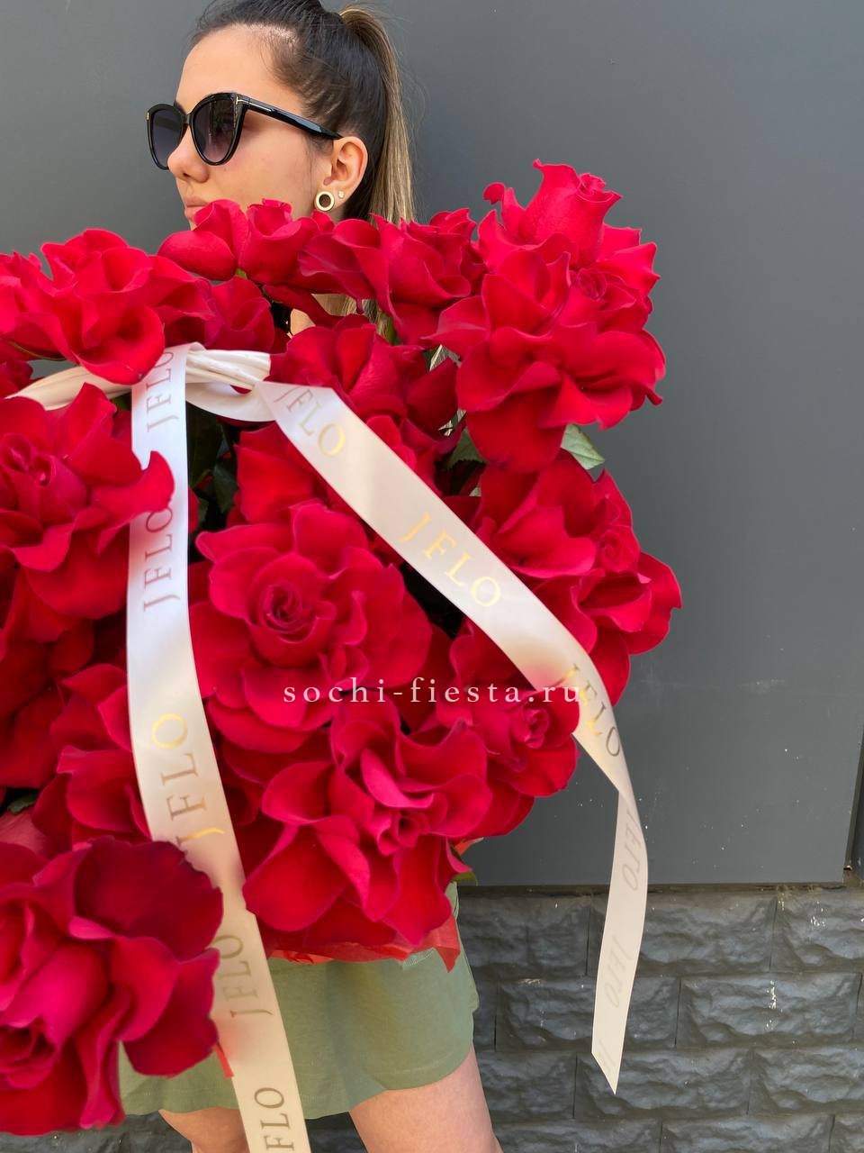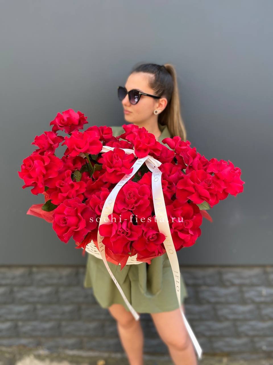555 роз, зелень (папоротник или эвкалипт, в зависимости от сезона) оформление в корзину. Длина надписи не должна превышать 4 букв.
