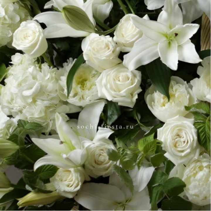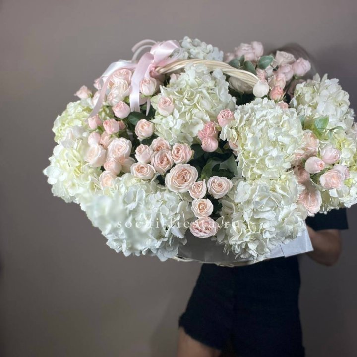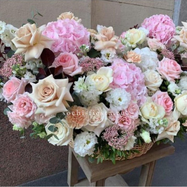 Состав корзин в Армавире определяется текущими поставками и сезоном. Розы Freedom, Mondial, Cappuccino — для классических куполообразных аранжировок. Пионы в мае-июне из свежих поставок: Sarah Bernhardt, Red Charm, Bowl of Cream — главный сезонный продукт. Хризантема, альстромерия, гербера — для объёмных торжественных наполнений. Эустома, ранункули — для садовых корзин. Флорист строит состав под конкретный запрос.