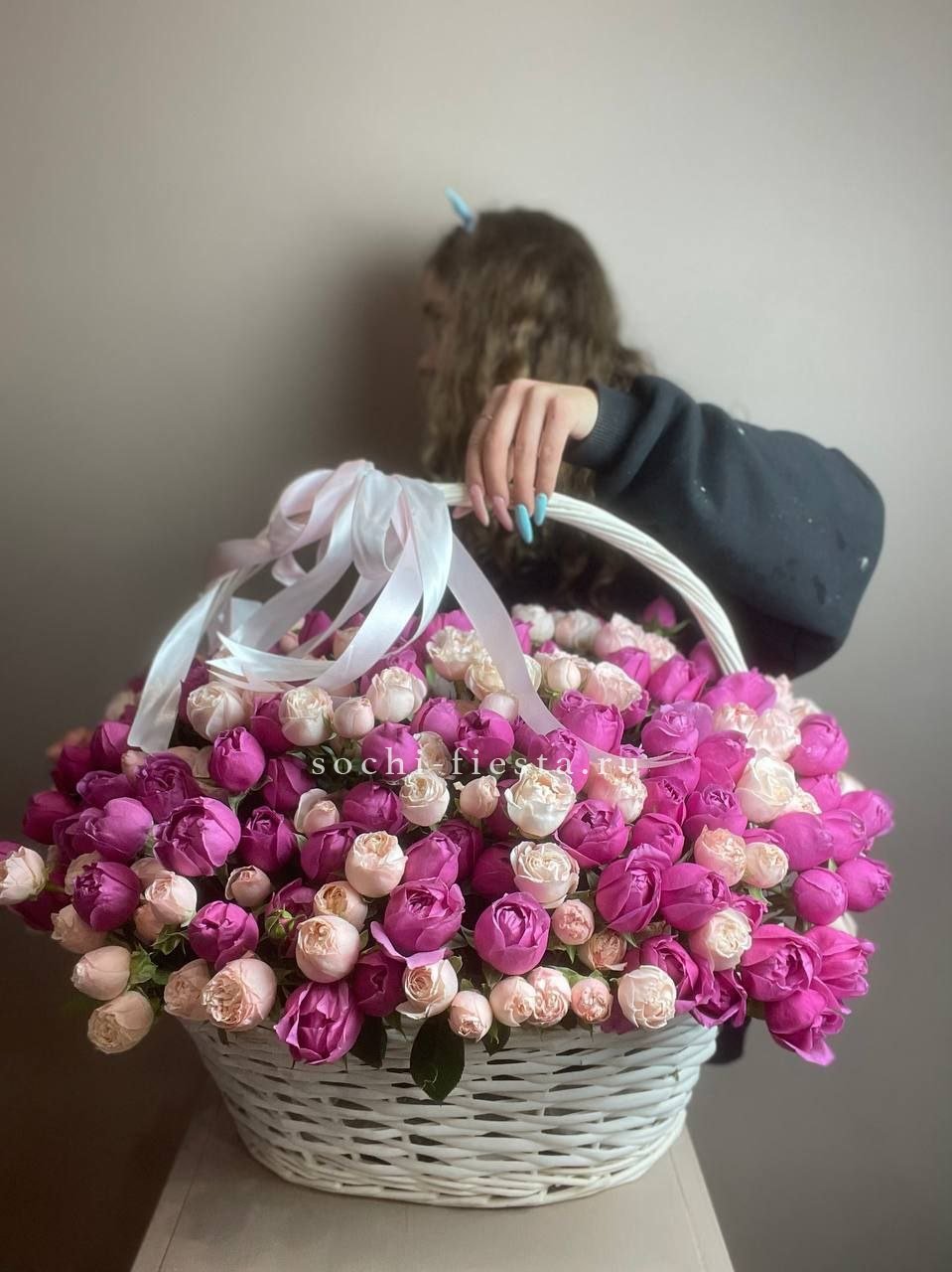 Эта роскошная интерьерная корзина — настоящее воплощение цветущего сада, наполненного нежностью и свежестью. Она выглядит невероятно объемной и фактурной благодаря гармоничному сочетанию классических и экзотических цветов.