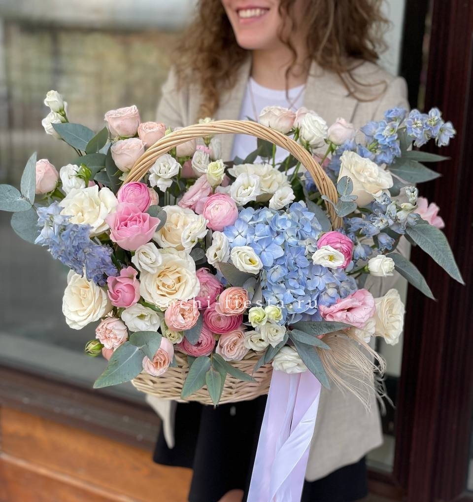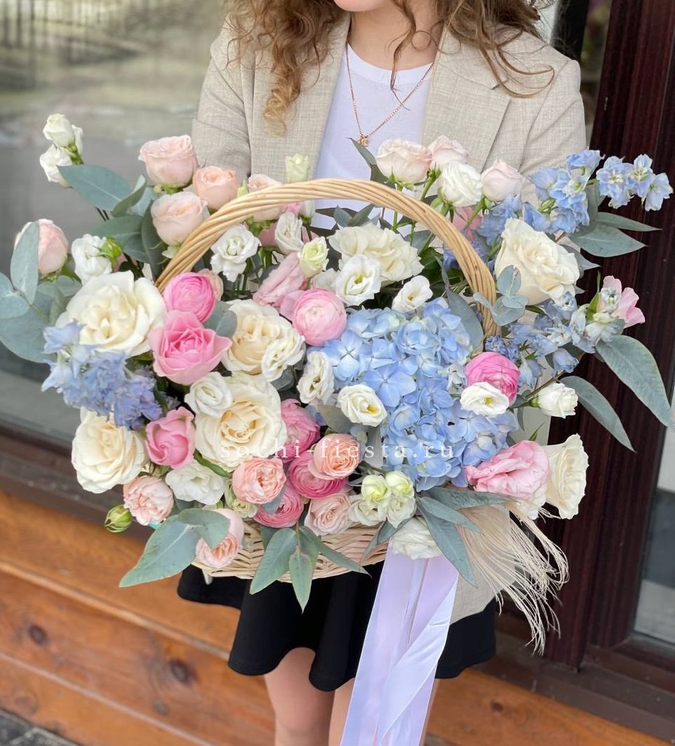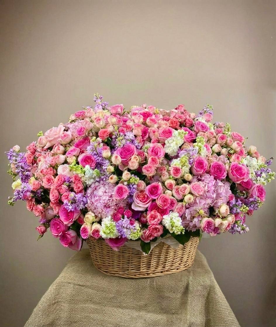 Широкая корзина вмещает пышную композицию из гортензий, эустом и пионовидных роз. Цветы располагаются свободно, создавая впечатление садовой клумбы, перенесенной в интерьер.
