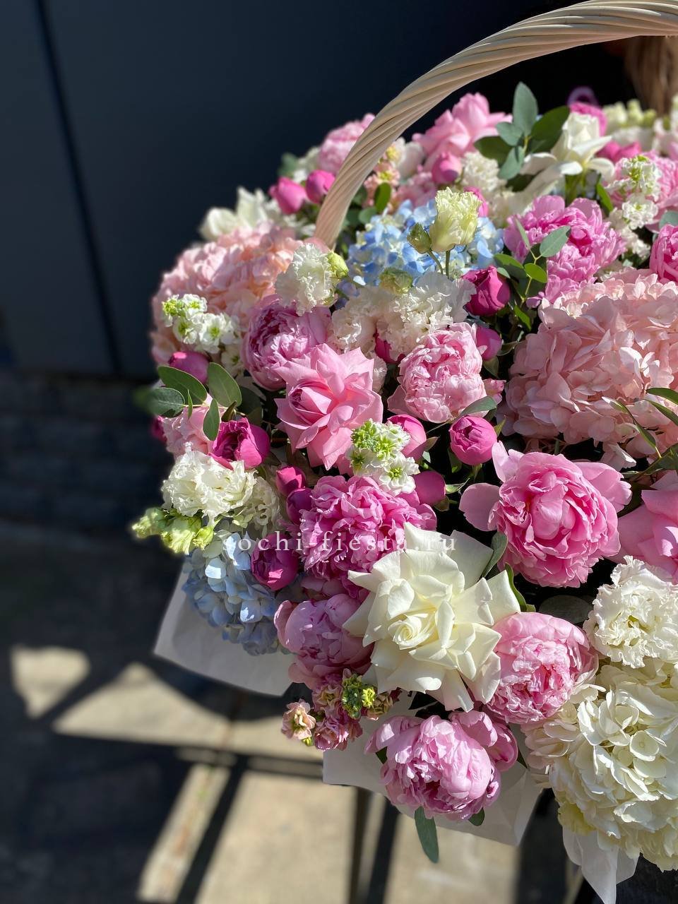 Пышная шапка гортензий в обрамлении воздушных соцветий Мисти Баблс создаёт объёмную композицию в светлой корзине. Эвкалипт добавляет зелени и завершает природную гармонию.