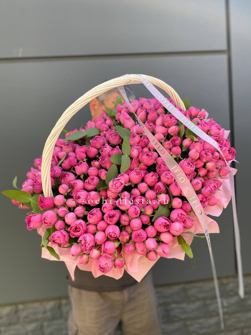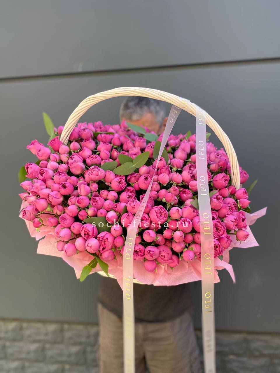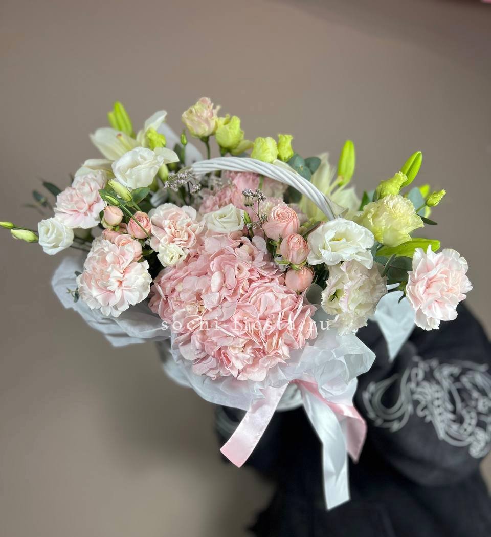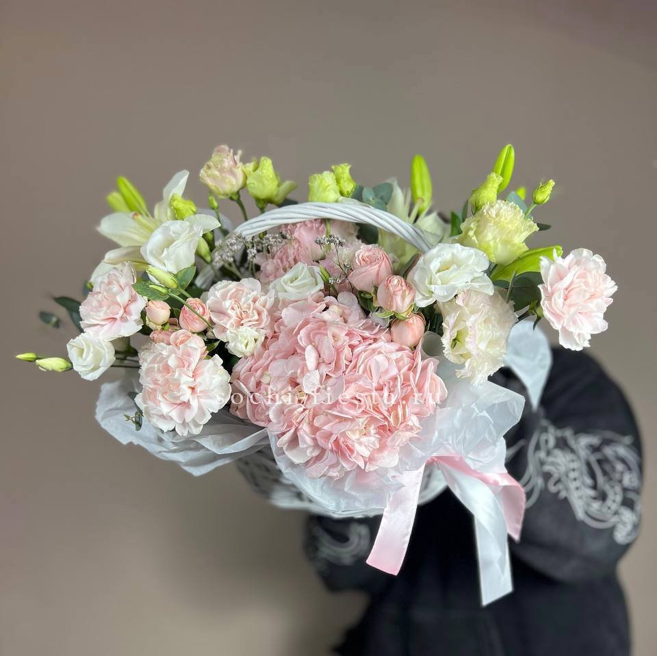 Корзина собрана плотно, каждый цветок находит своё место в общей композиции.