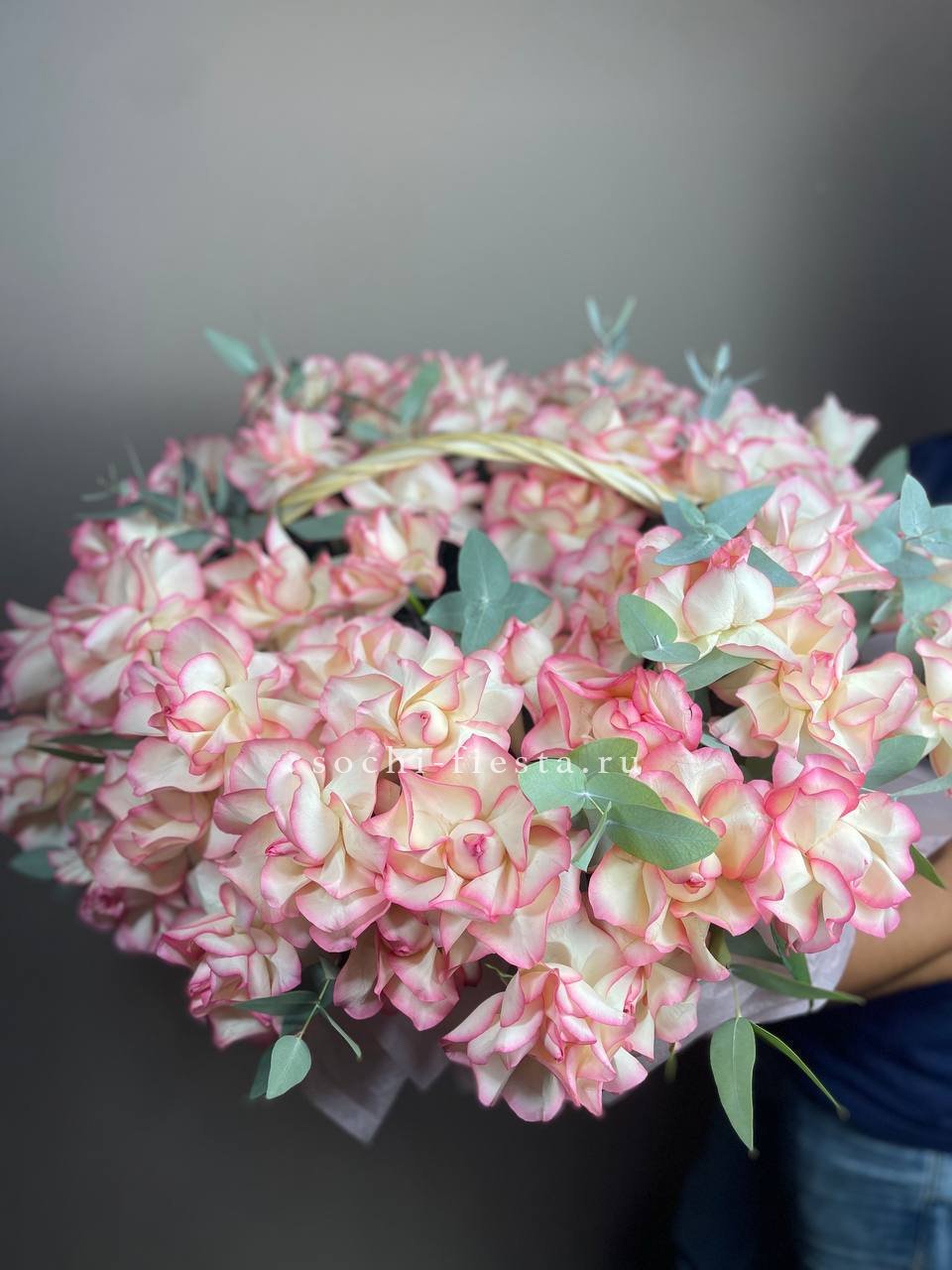розы одноголовые, диантусы, роза пионовидная, тюльпаны (в сезон или аналог), маттиола, эустома, эвкалипт, декоративная трава, озотамус корзина D40.