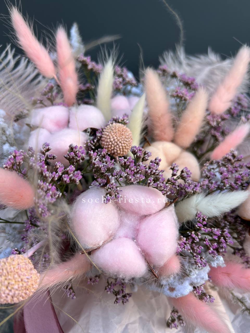 Пятьдесят один бутон Мисти Баблс собраны в плетёную корзину и образуют плотную цветущую полусферу. Лавандовые оттенки раскрываются постепенно и держат форму долго.