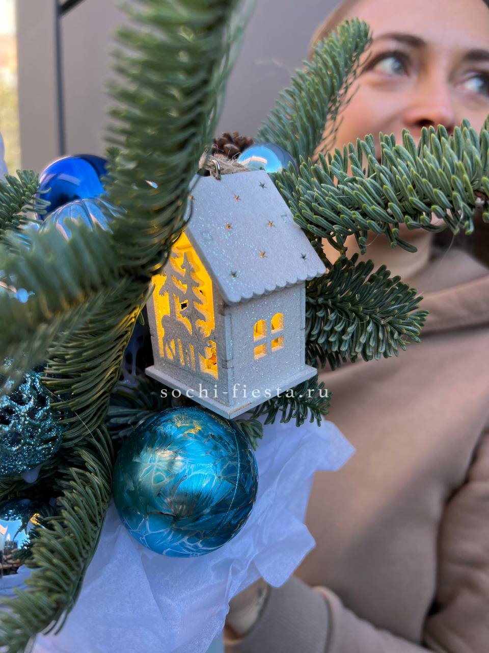 Компактная композиция в синей гамме собирает вокруг свечей ветки нобилиса и праздничные украшения. Цилиндрическая форма удобно размещается на столе или комоде. Живая хвоя сохраняет свежесть на протяжении всех праздников.
