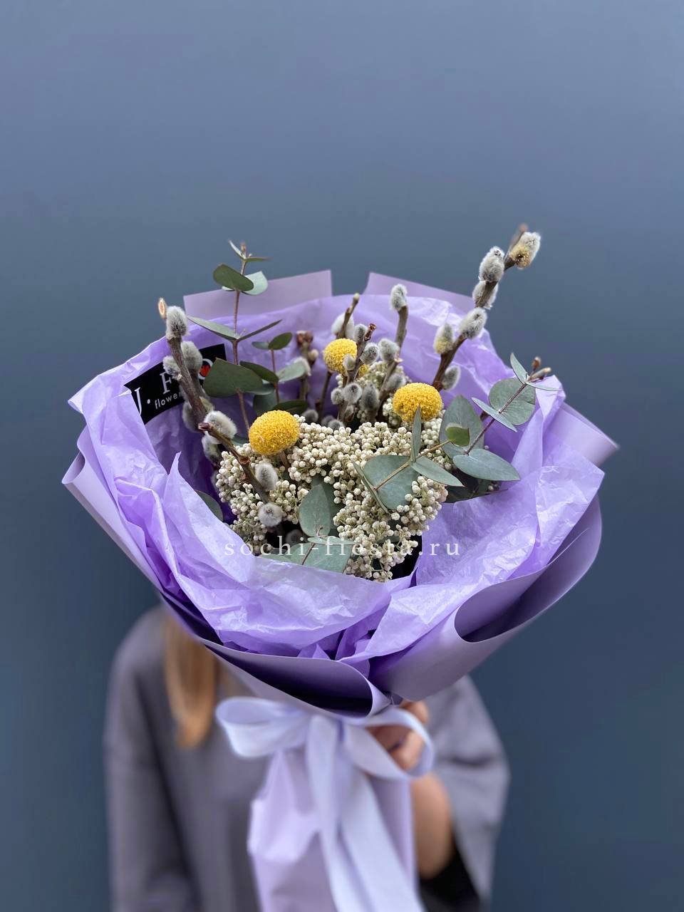 белые розы, верба, лагурус, эвкалипт, яица, сумочка.