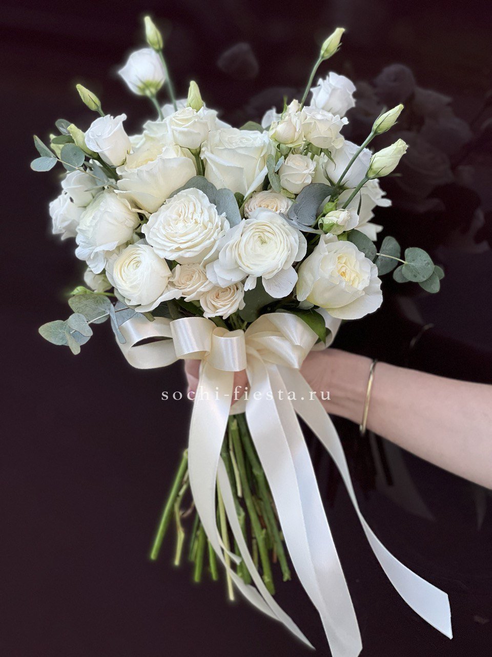 Двадцать один белый диантус собран в плотную округлую форму с серебристыми ветками эвкалипта. Классический свадебный букет с аккуратным силуэтом и атласной лентой на ножке.